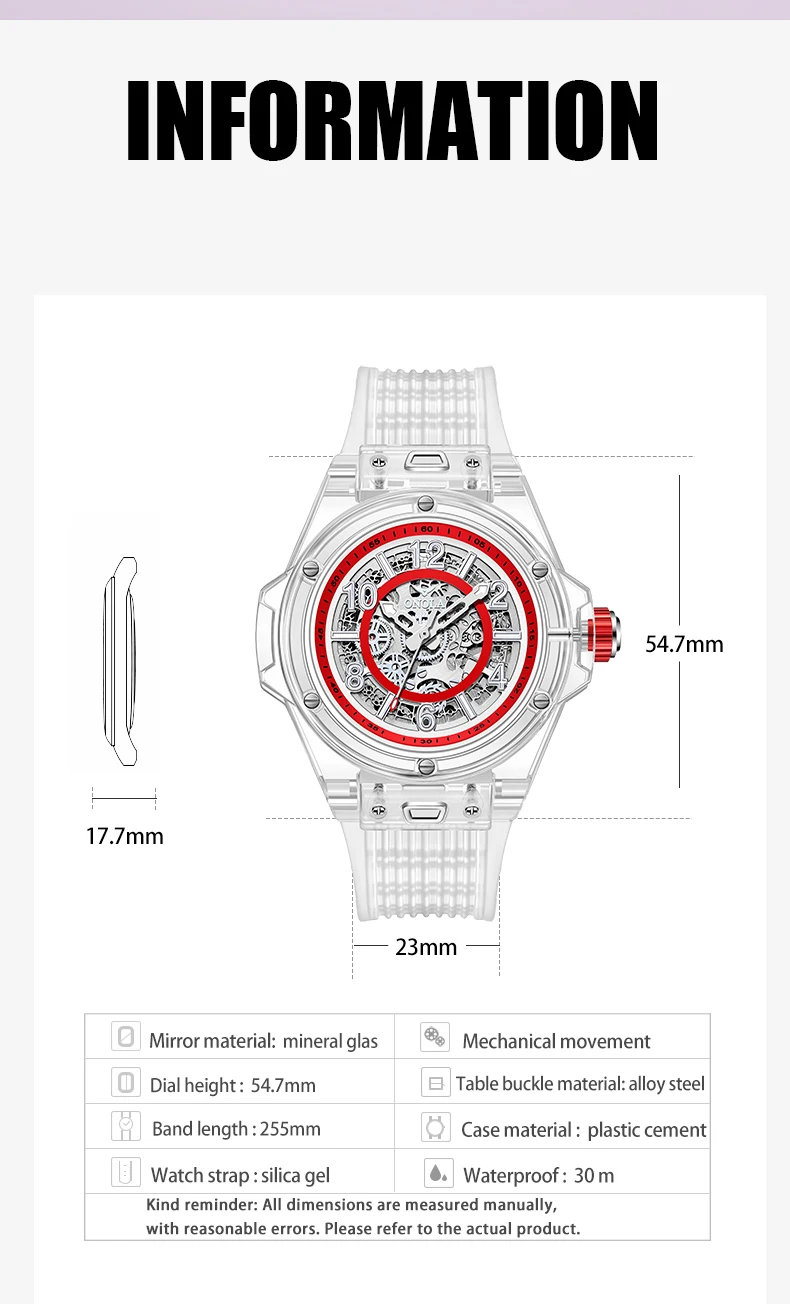 4. Due to shooting equipment and other reasons, there may be some color difference between the actual watch and the picture. Since the sizes are all measured manually, the actual figures may have some slight errors.Please ensure that you can accept this before placing an order. Thank you.