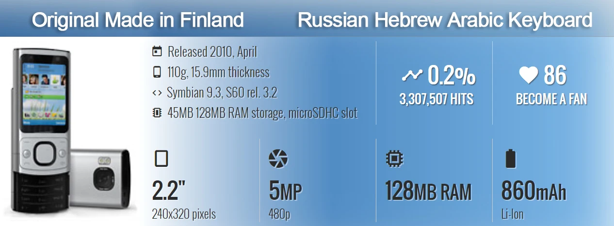 Be the first to review “Original 6700 slide 6700s 3G 5MP Camera Bluetooth CellPhone Russian Arabic Hebrew Keyboard Made in Finland”