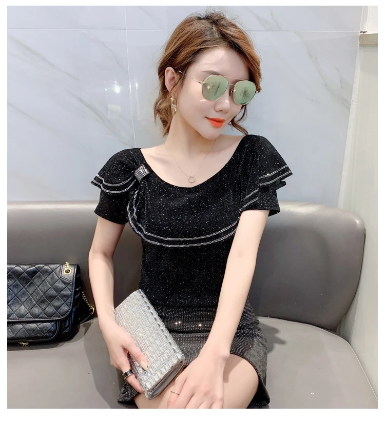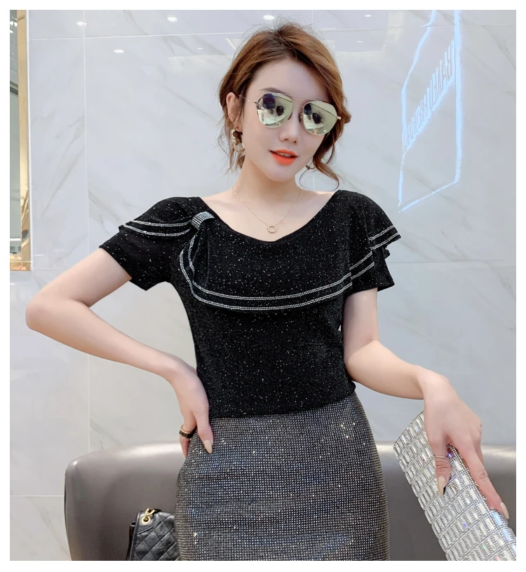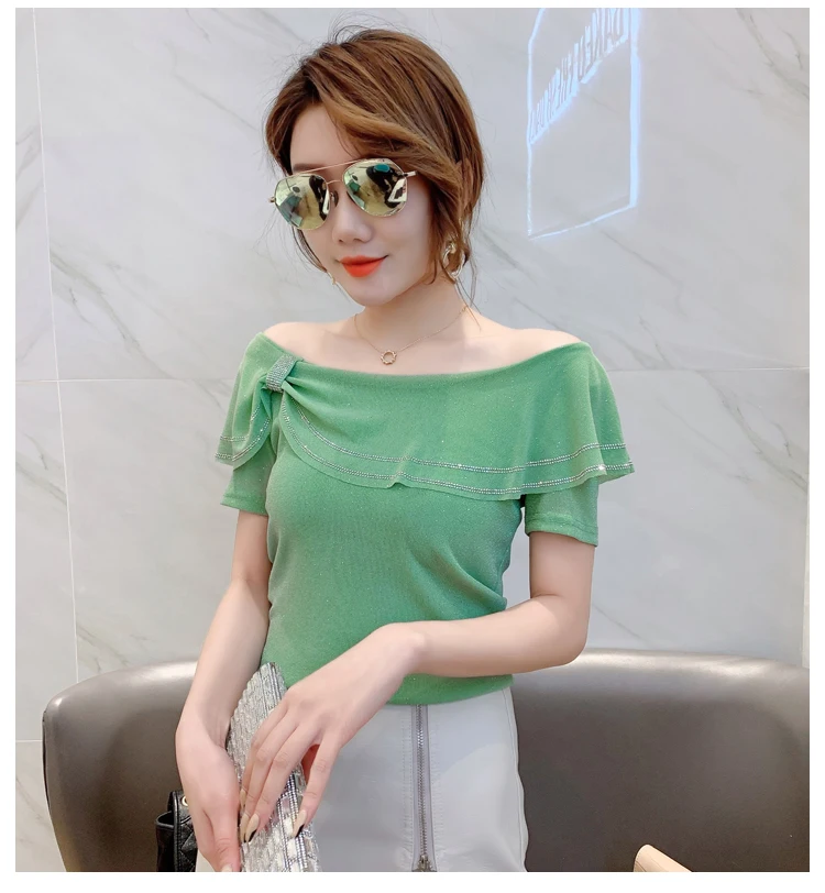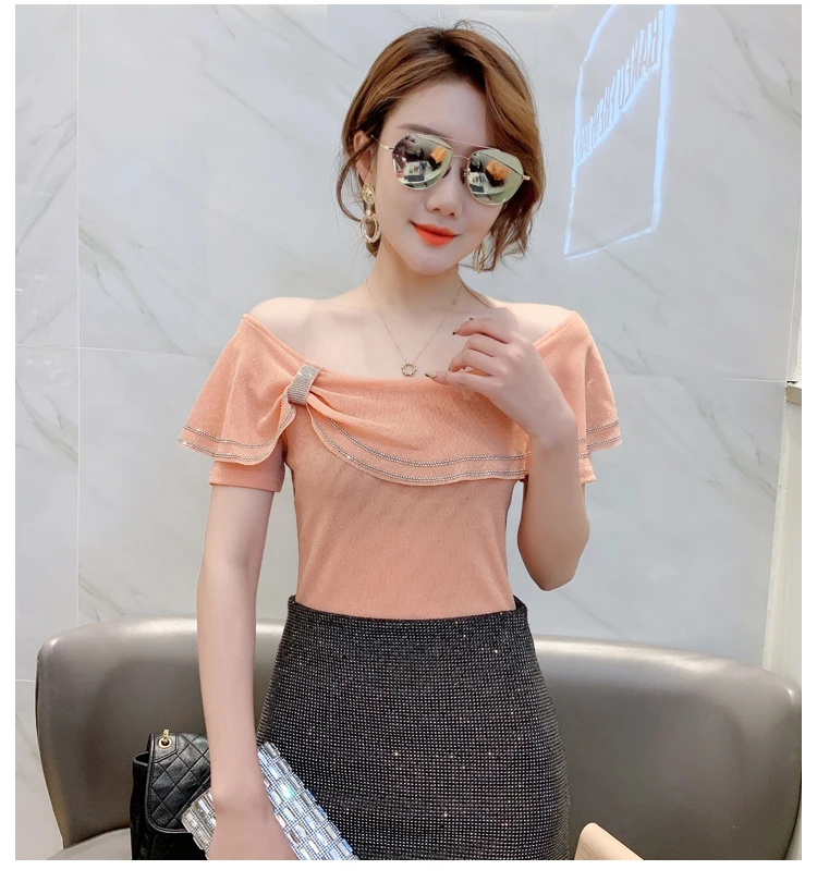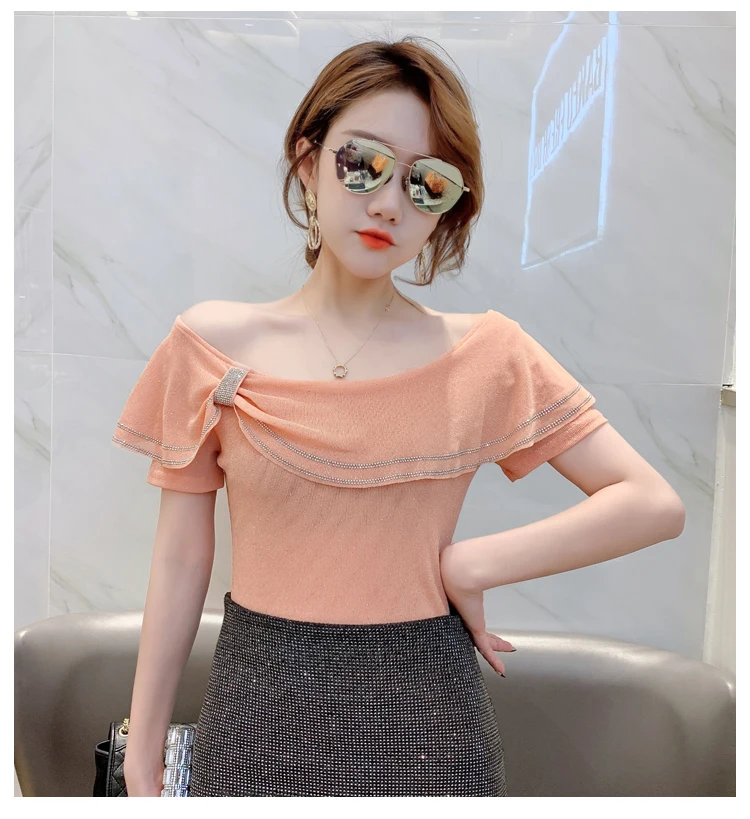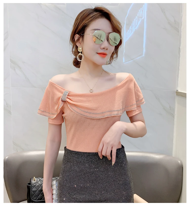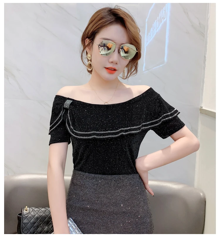 oulder Bared Me T-irt Women's ort Sve Glittering Drill Faionable Korean Sle Slim Fit round Ne Classic Pattern