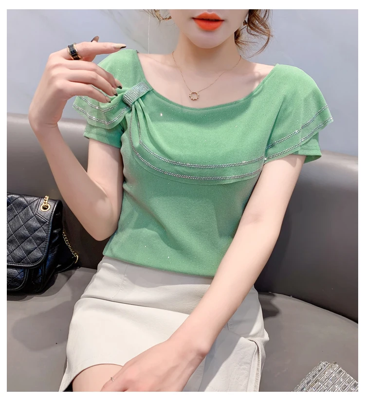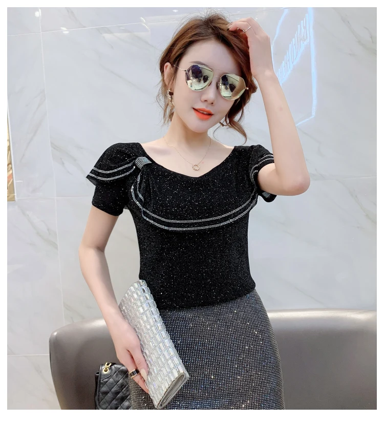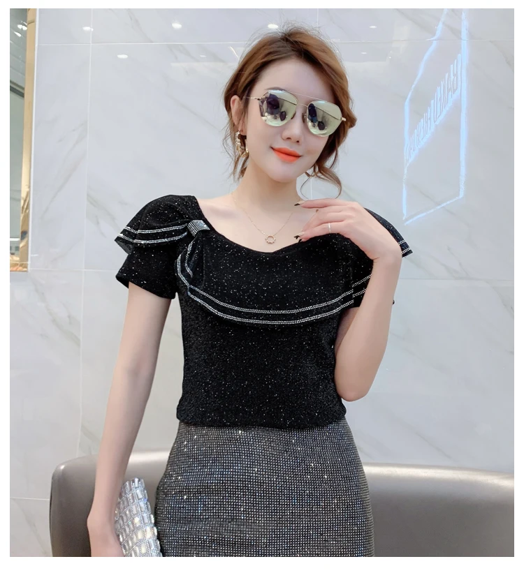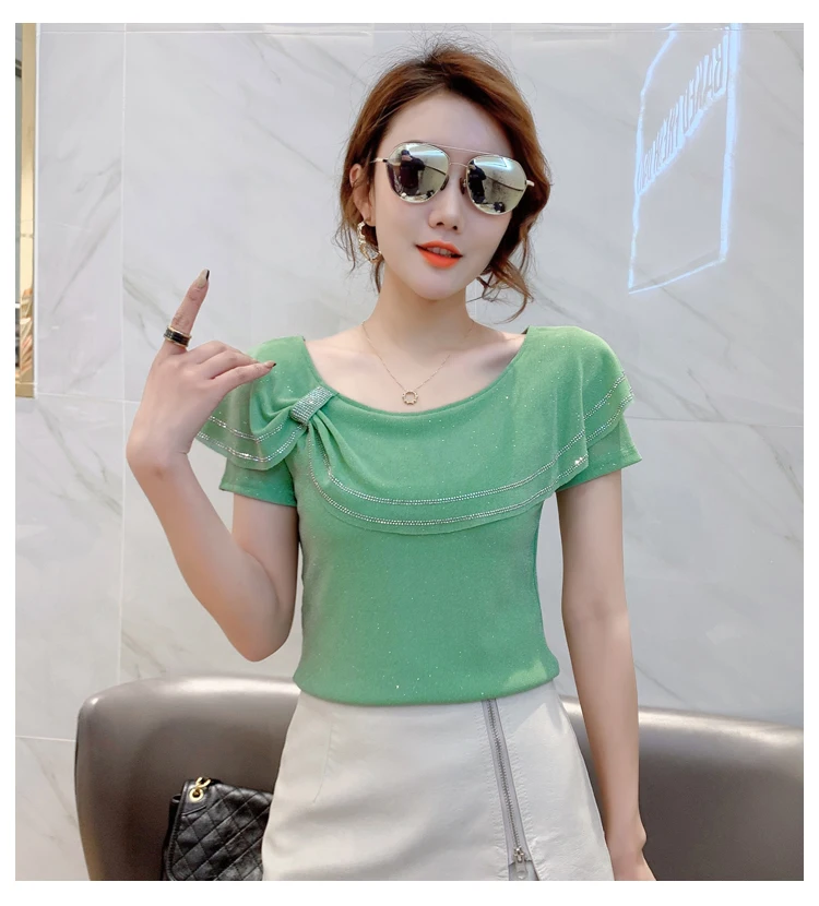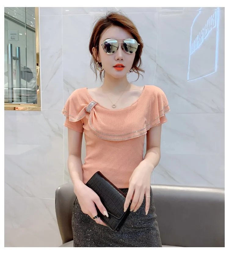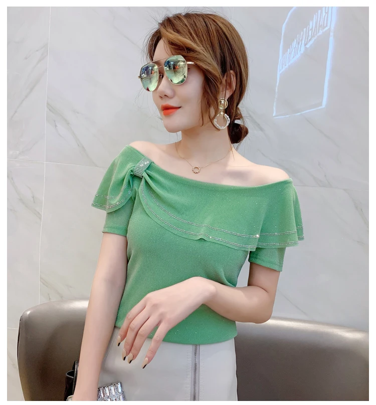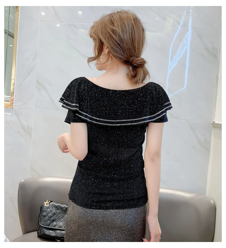 oulder Bared Me T-irt Women's ort Sve Glittering Drill Faionable Korean Sle Slim Fit round Ne Classic Pattern