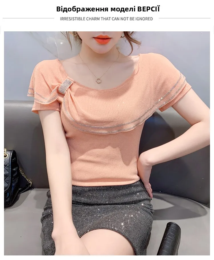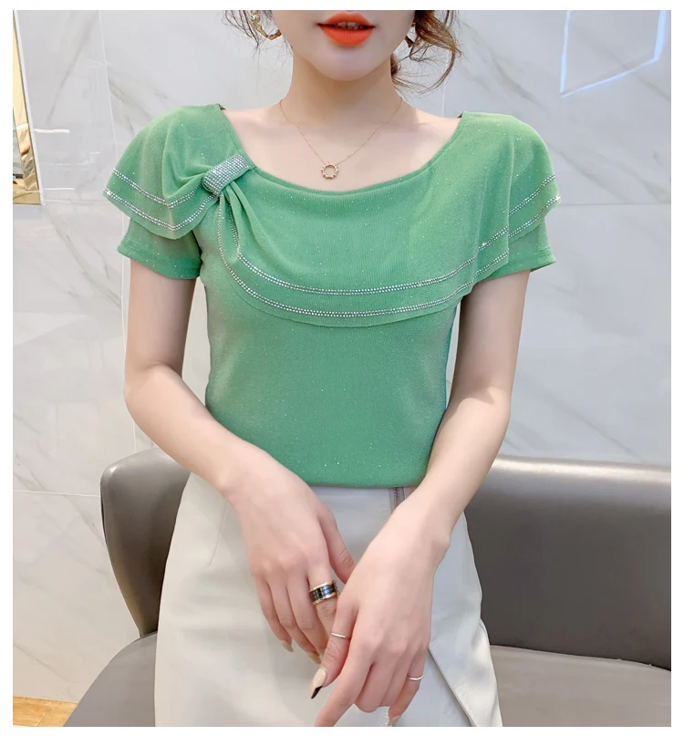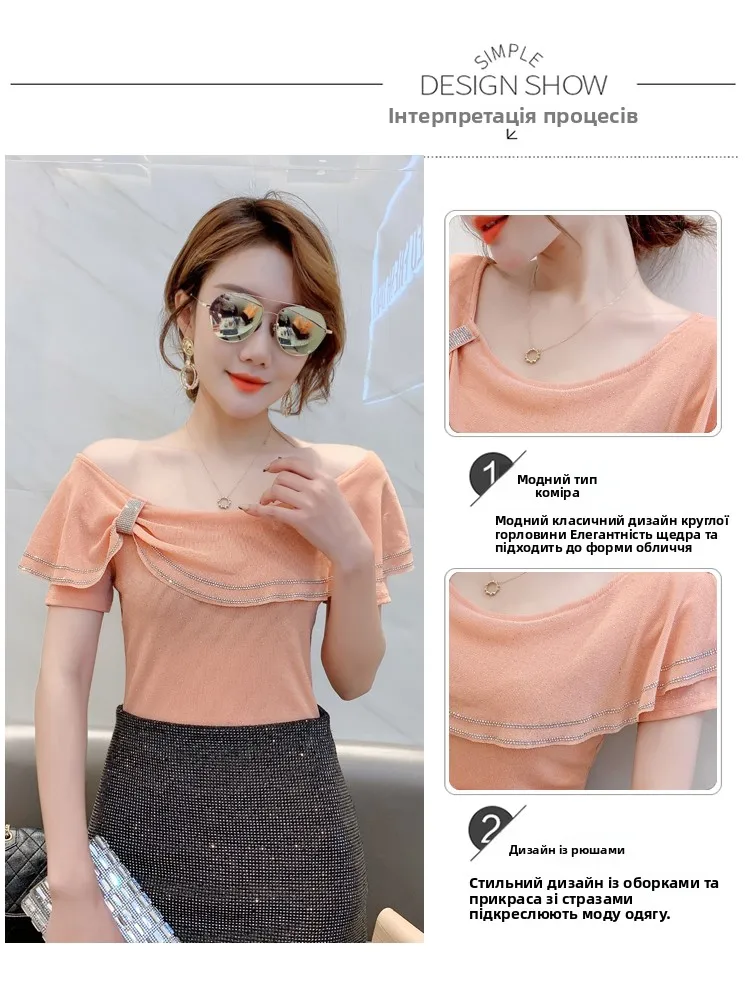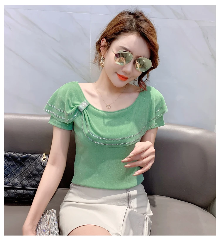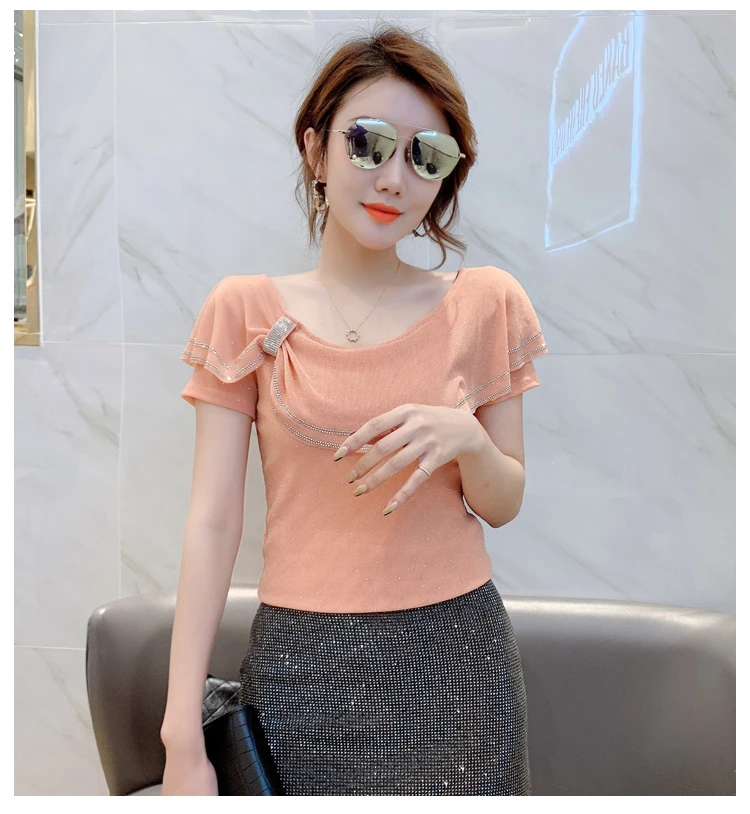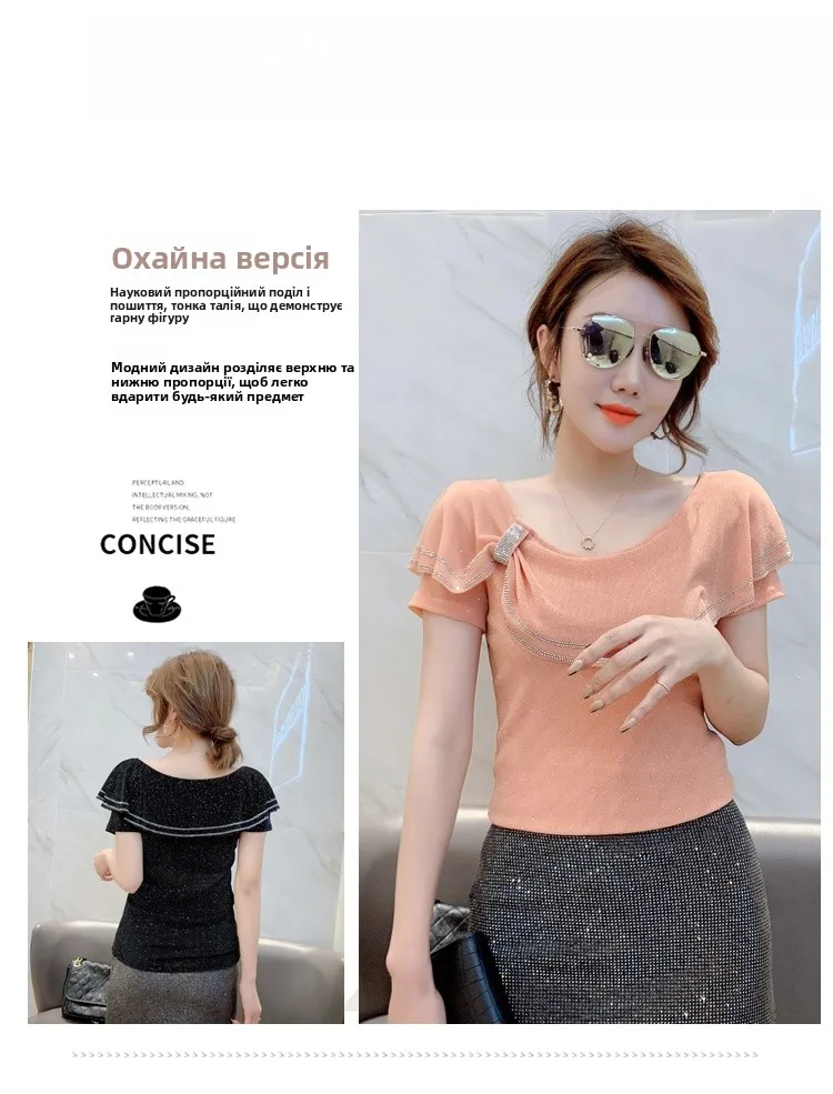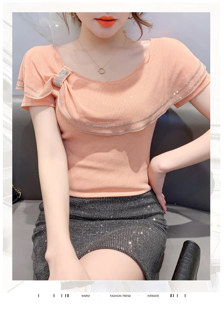 oulder Bared Me T-irt Women's ort Sve Glittering Drill Faionable Korean Sle Slim Fit round Ne Classic Pattern