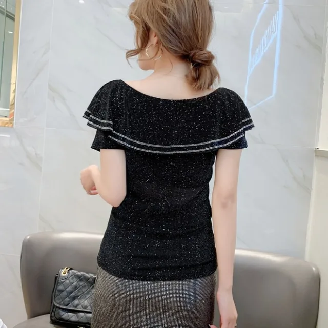 oulder Bared Me T-irt Women's ort Sve Glittering Drill Faionable Korean Sle Slim Fit round Ne Classic Pattern