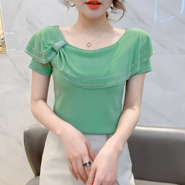 oulder Bared Me T-irt Women’s ort Sve Glittering Drill Faionable Korean Sle Slim Fit round Ne Classic