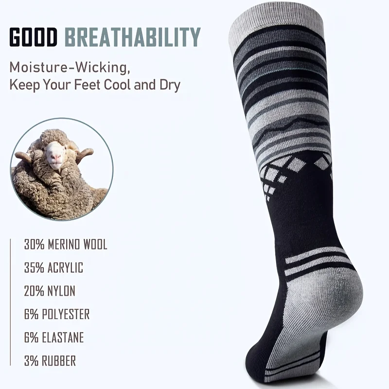 30% Merino Wool For Extra Warmth and Comfort: Softer and finer than regular wool, Merino provides soft and itch-free comfort against the skin. Its natural temperature regulation keeps you warm in the cold and wicks moisture, ensuring all-day comfort in any season. Merino Wool Ski Socks deliver exceptional wearing experience during long time in cold weather.