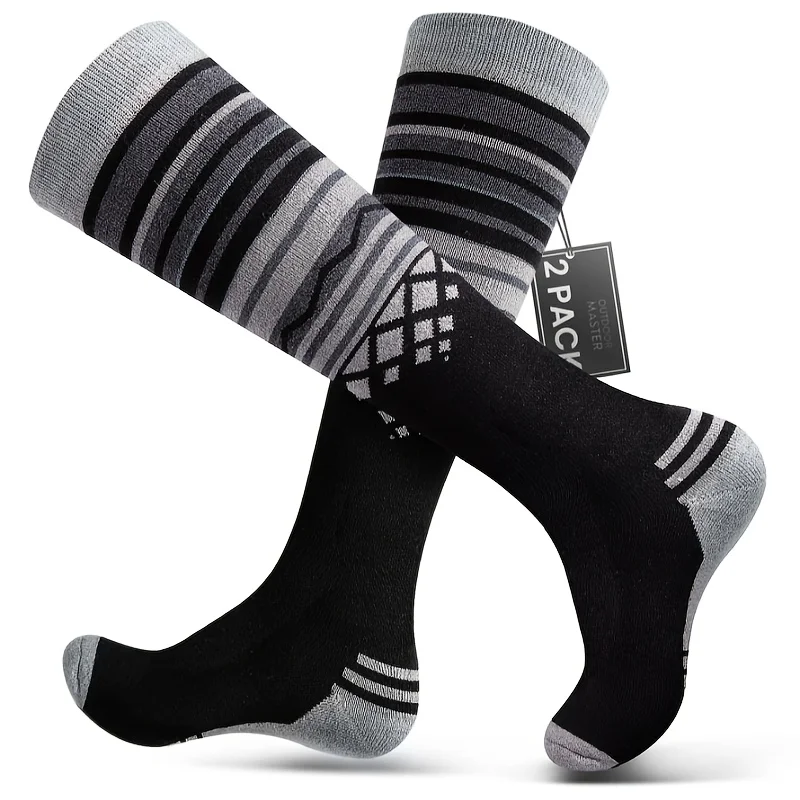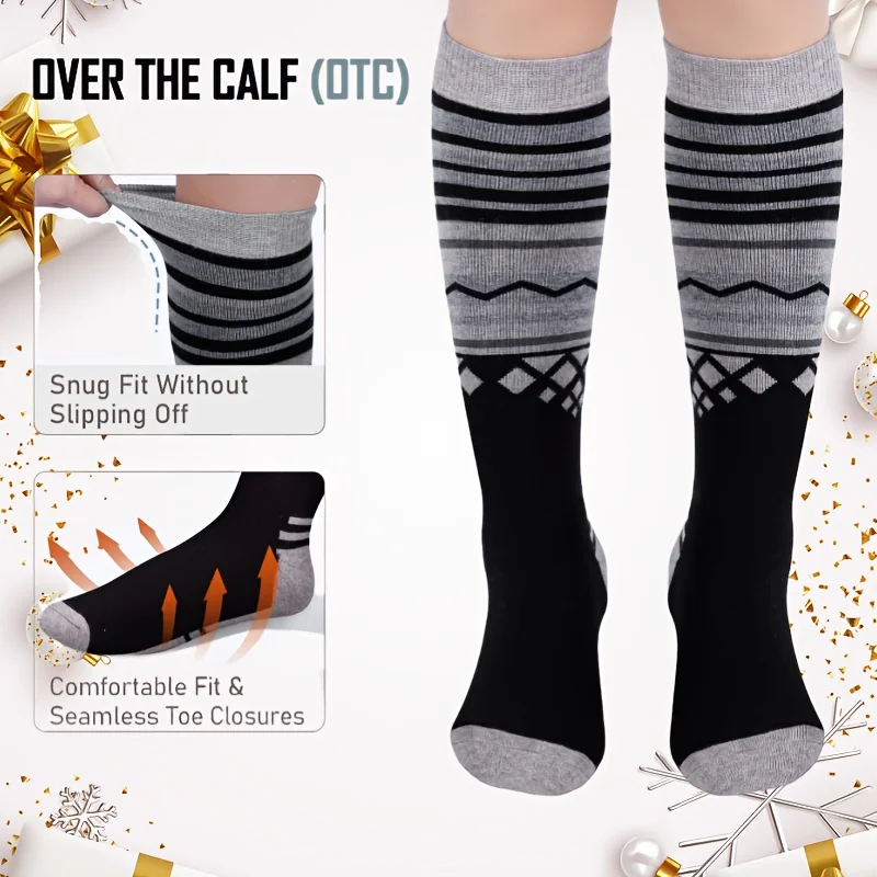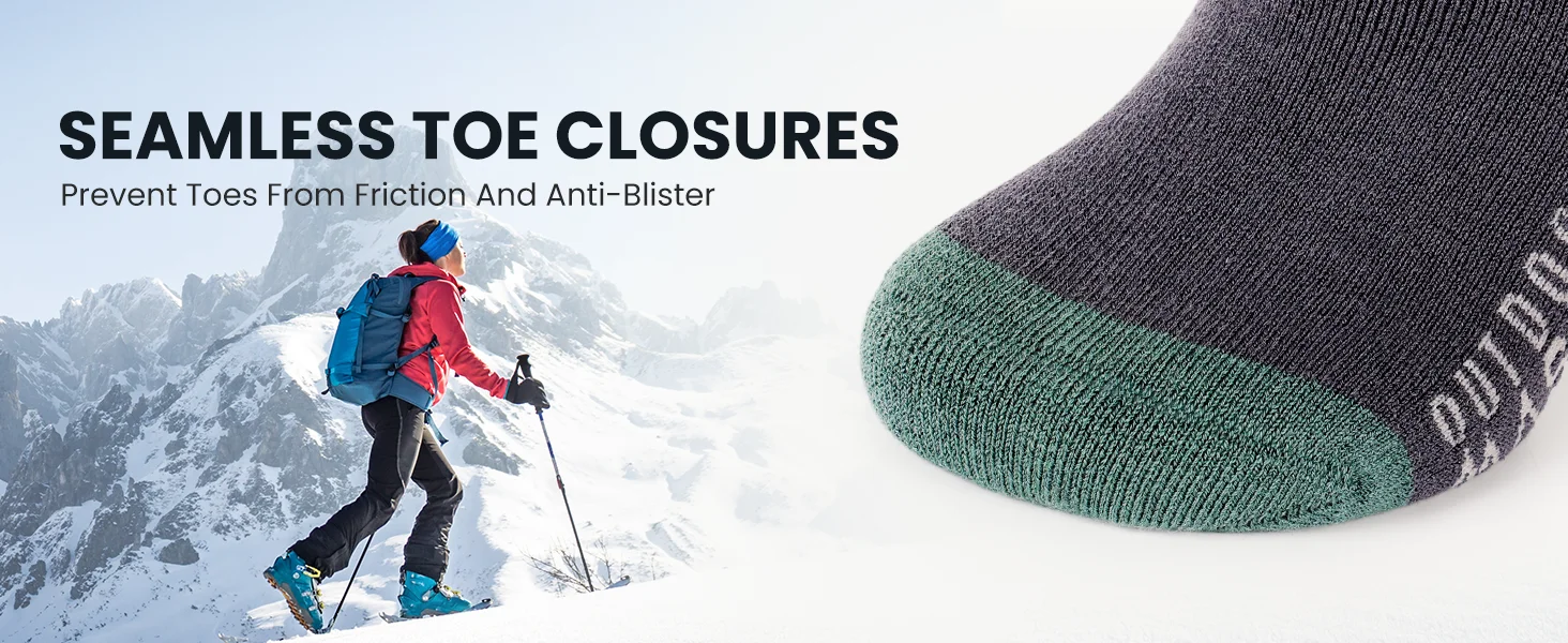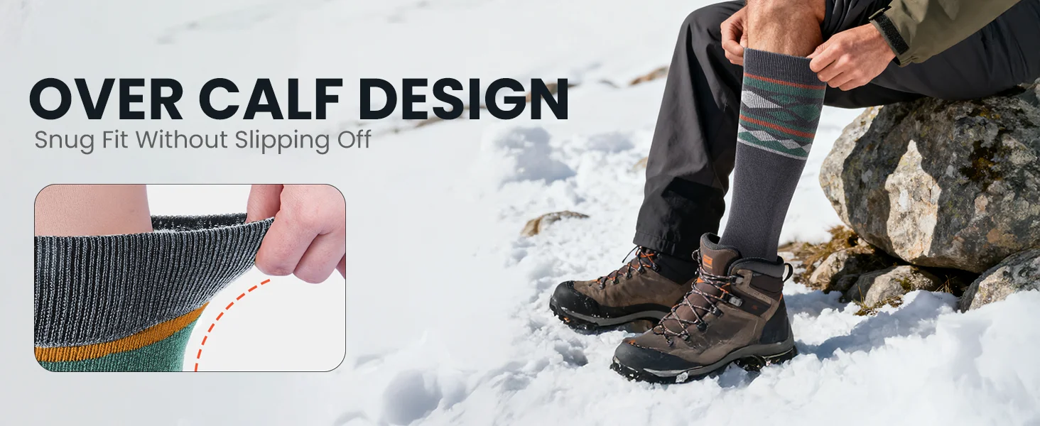 Over-the-Calf & Seamless Toe Design – The over calf length offers added warmth and support for your calves, while the seamless toe reduces friction and helps prevent blisters. The non-slip cuff keeps the ski socks securely in place without sliding down, ensuring a perfect fit inside your over-the-calf ski boots.