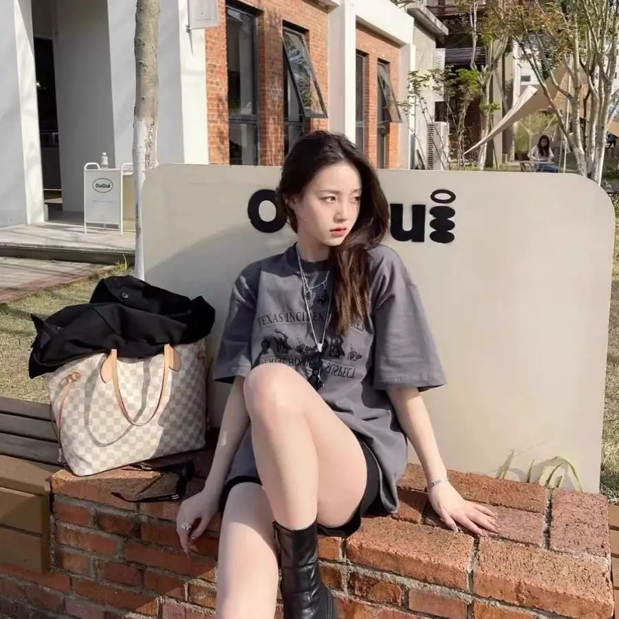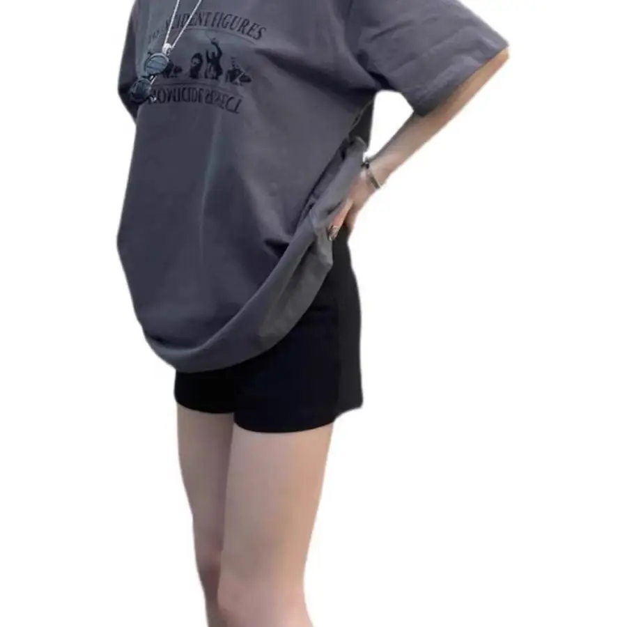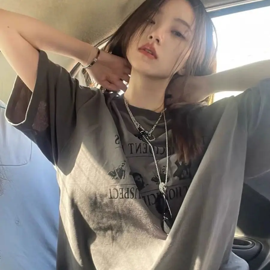 Oversize Loose Fit Deep ey ort Sve T-irt Women's American Retro Lazy Sle Casual Top Polyester Fiber Summer Wear