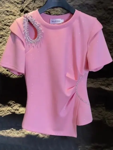 European and American new hit fashion women's pleated chain embellished V-neck plus-size T-shirt top