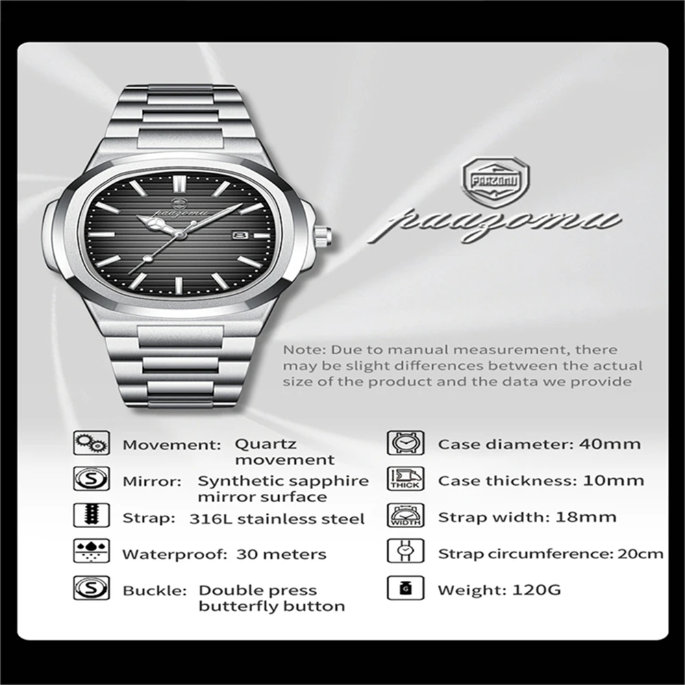 PAAZOMU Square Luxury Men Wristwatch Waterproof Luminous Date Stainless Steel Male Clock Business Sports
