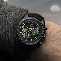 Equipped with a black leather strap with three different rubber colours in the middle, this watch remains true to the pioneering spirit of its unique design. Black is the predominant colour throughout.