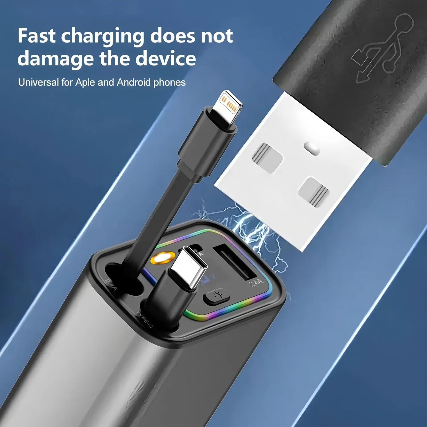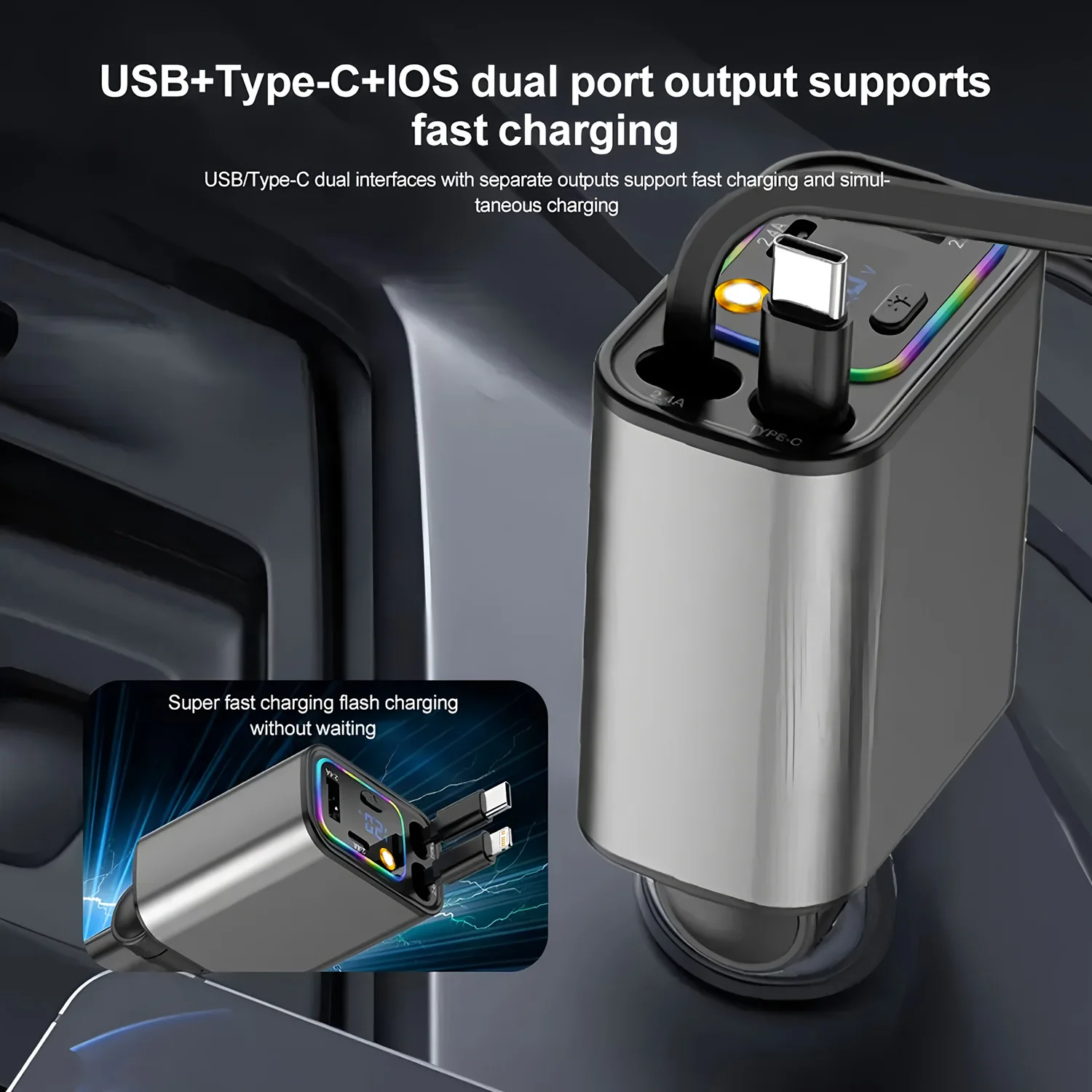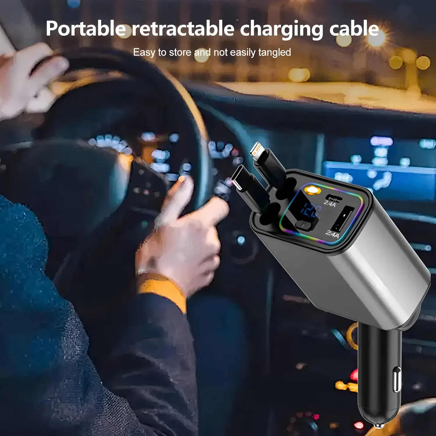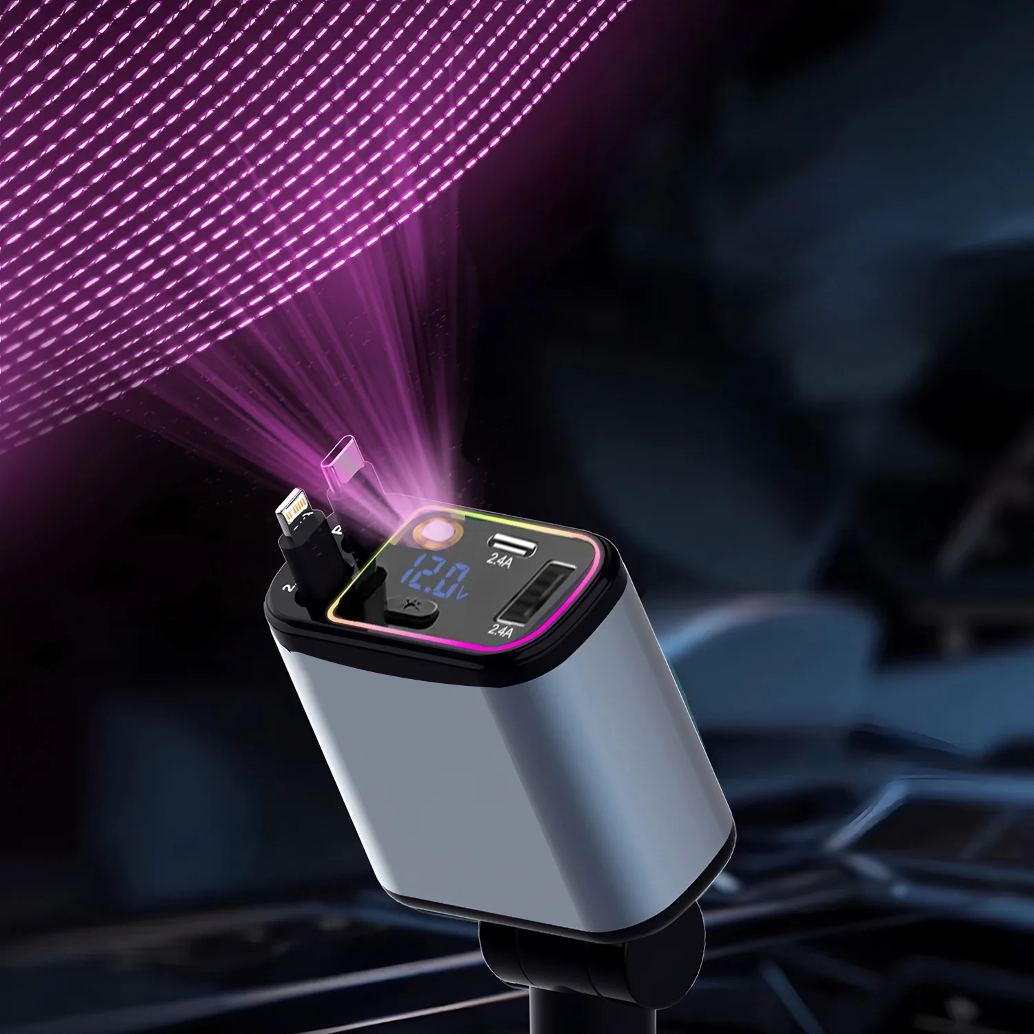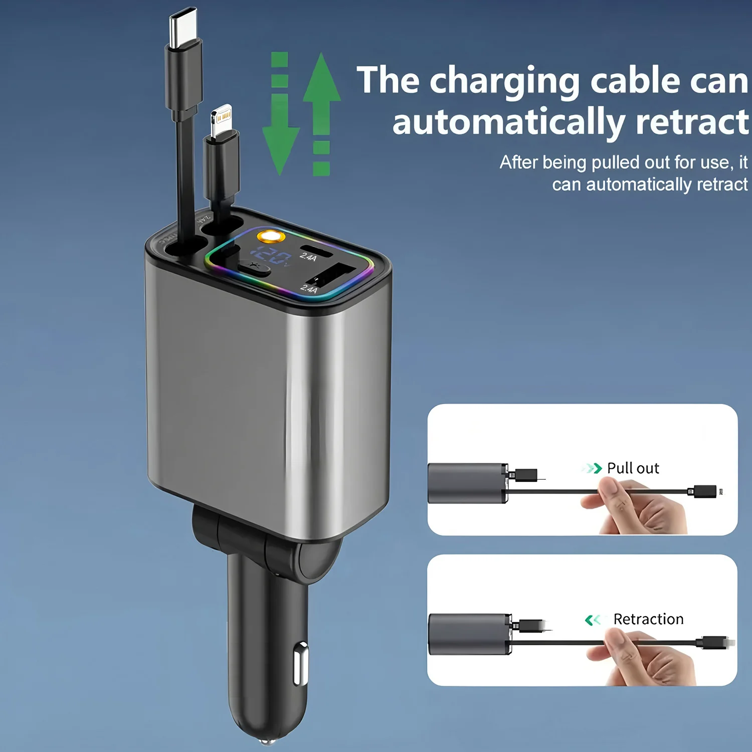 120W 7-in-1 Car Charger Super Fast Charging with Retractable Cable and Ambiance Light Voltage Display for iPhone Huawei Samsung