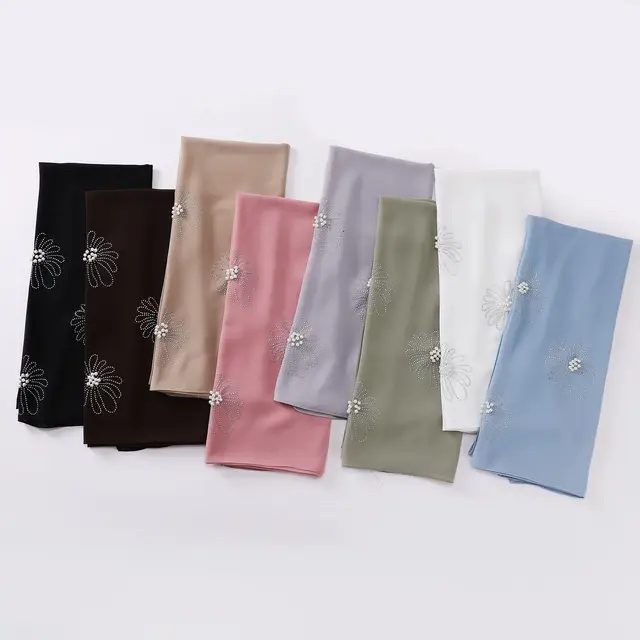 Pearl Chiffon Flower Long Scarf Bead Hijab Muslim Headscarf Women Islam Stole Shawl Wrap Veil Bandanas