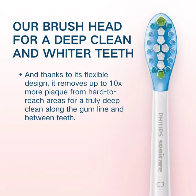 Enjoy the deepest cleaning possible with the C3 Smart Brush Head.The soft, flexible bristles are carefully designed to curve to the contours of your teeth, increasing the surface area reached up to 4 times** and removing up to 10 times more plaque from hard-to-reach areas.