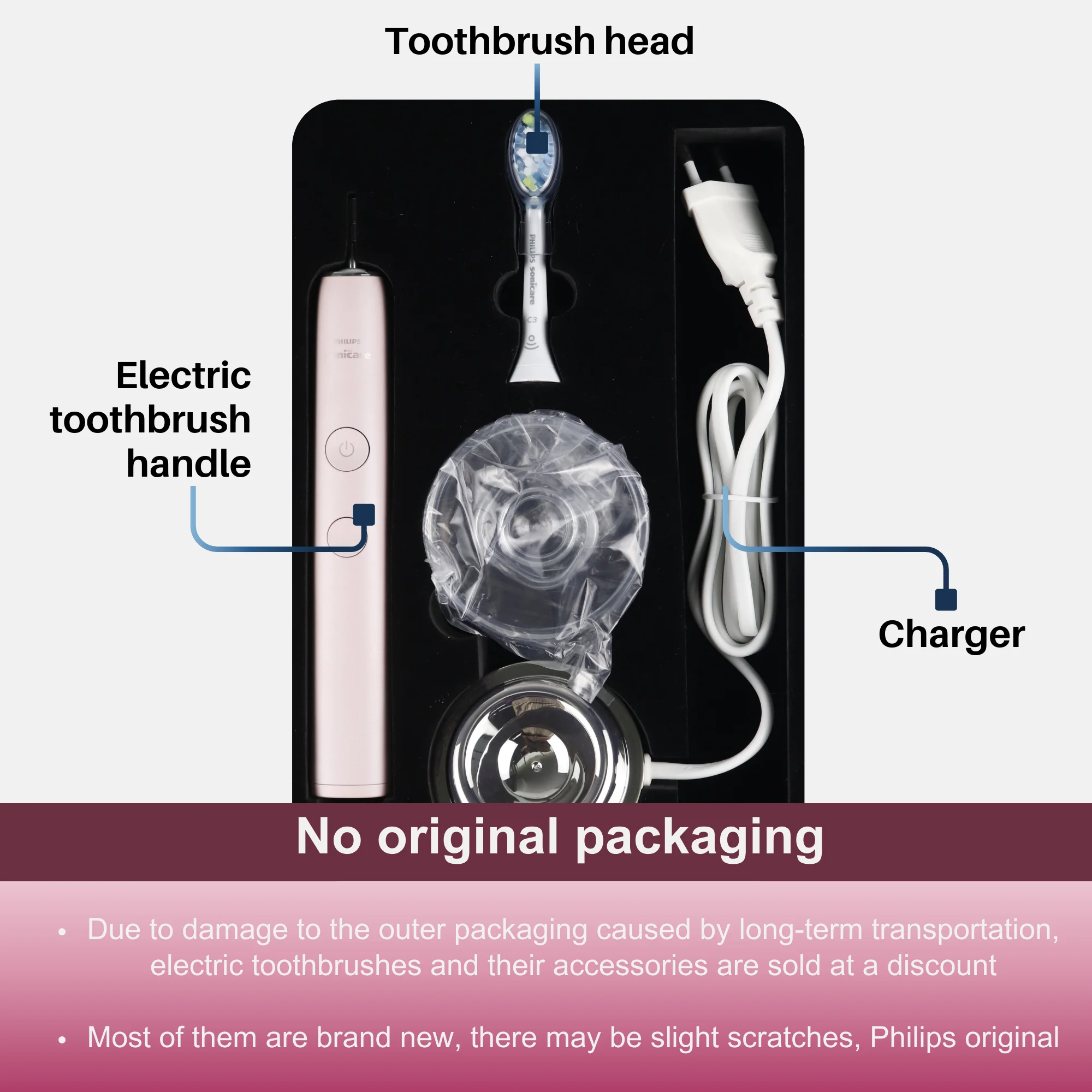 Due to damage to the outer packaging of the product during long-distance transportation, we now provide electric toothbrush handles at discounted prices.Electric toothbrushes, brush heads and chargers are all original brand new and sold after repackaging.