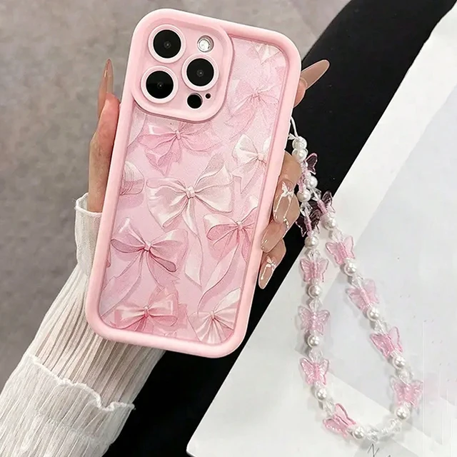 -8%Pink Bow Pattern Silicone Phone Case For iPhone 16 17 Pro Max 15 14 13 12 11 Pro Max 16E X XS XR 7 8 Plus Butterfly Charm Cover