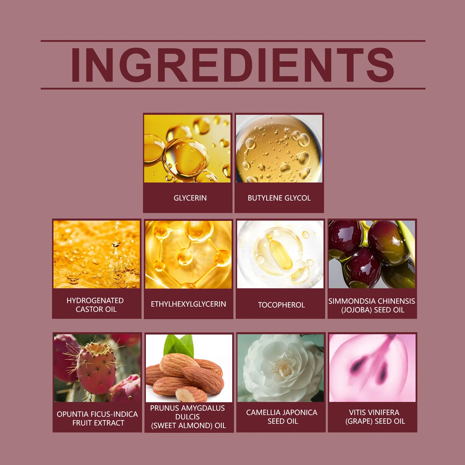 ●INGREDIENTS:GLYCERIN、BUTYLENE GLYCOL、HYDROGENATED CASTOR OIL、ETHYLHEXYLGLYCERIN、TOCOPHEROL、SIMMONDSIA CHINENSIS (JOJOBA) SEED OIL、OPUNTIA FICUS-INDICA FRUIT EXTRACT、PRUNUS AMYGDALUS DULCIS (SWEET ALMOND) OIL、CAMELLIA JAPONICA SEED OIL、VITIS VINIFERA (GRAPE) SEED OIL
