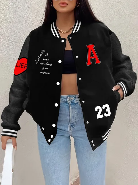 Plus Hope Something Good Happens Prints Baseball Coat Womens Basics Jackets Fleece Warm Soft Tops Casual