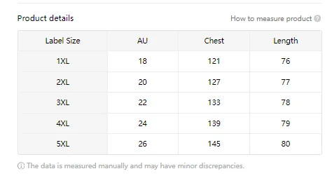 | size_info | {"sizeInfoList":[{"length":{"cm":"121","inch":"47.64"},"size":"1XL","vid":12668979},{"length":{"cm":"127","inch":"50.00"},"size":"2XL","vid":200000322},{"length":{"cm":"133","inch":"52.36"},"size":"3XL","vid":115781},{"length":{"cm":"139","inch":"54.72"},"size":"4XL","vid":200000990},{"length":{"cm":"145","inch":"57.09"},"size":"5XL","vid":200000991}]} |