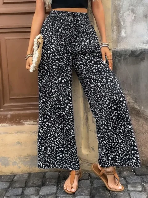Plus Size 1XL-5XL Women Fashion Floral Wide Leg Pants For Women Flowy Ruffled High Waisted Summer Straight Pants
