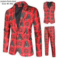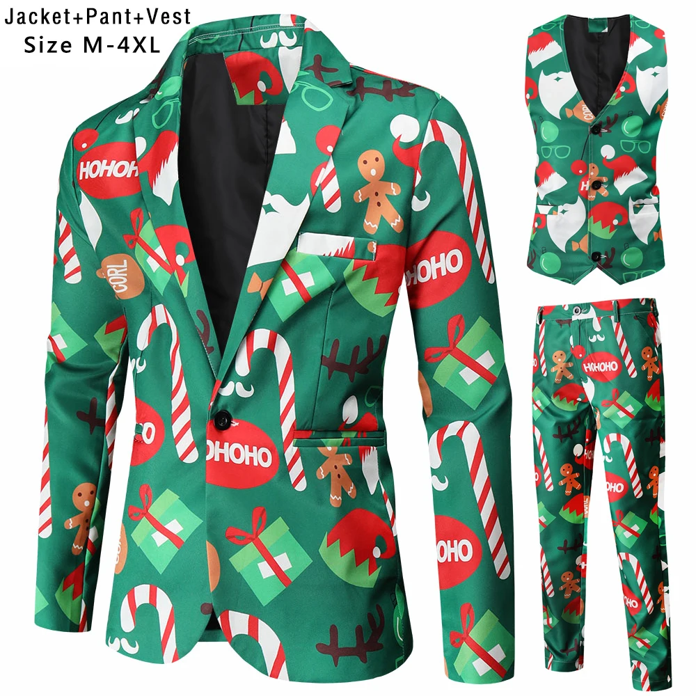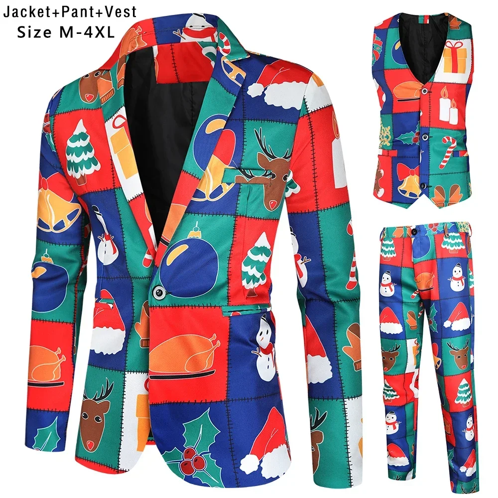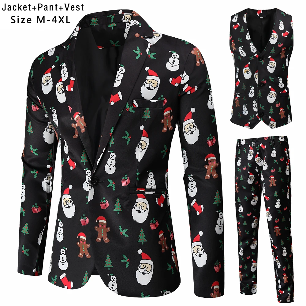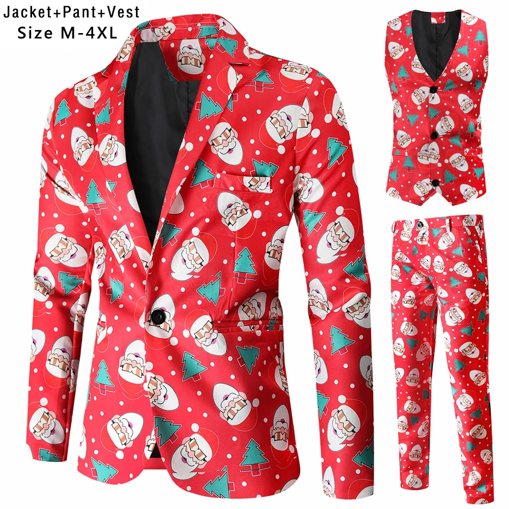 Plus Size 4XL Christmas Men 3 Piece Suits Fashion Sunglasses Santa Claus Printing Mens Sets Blazers Jacket