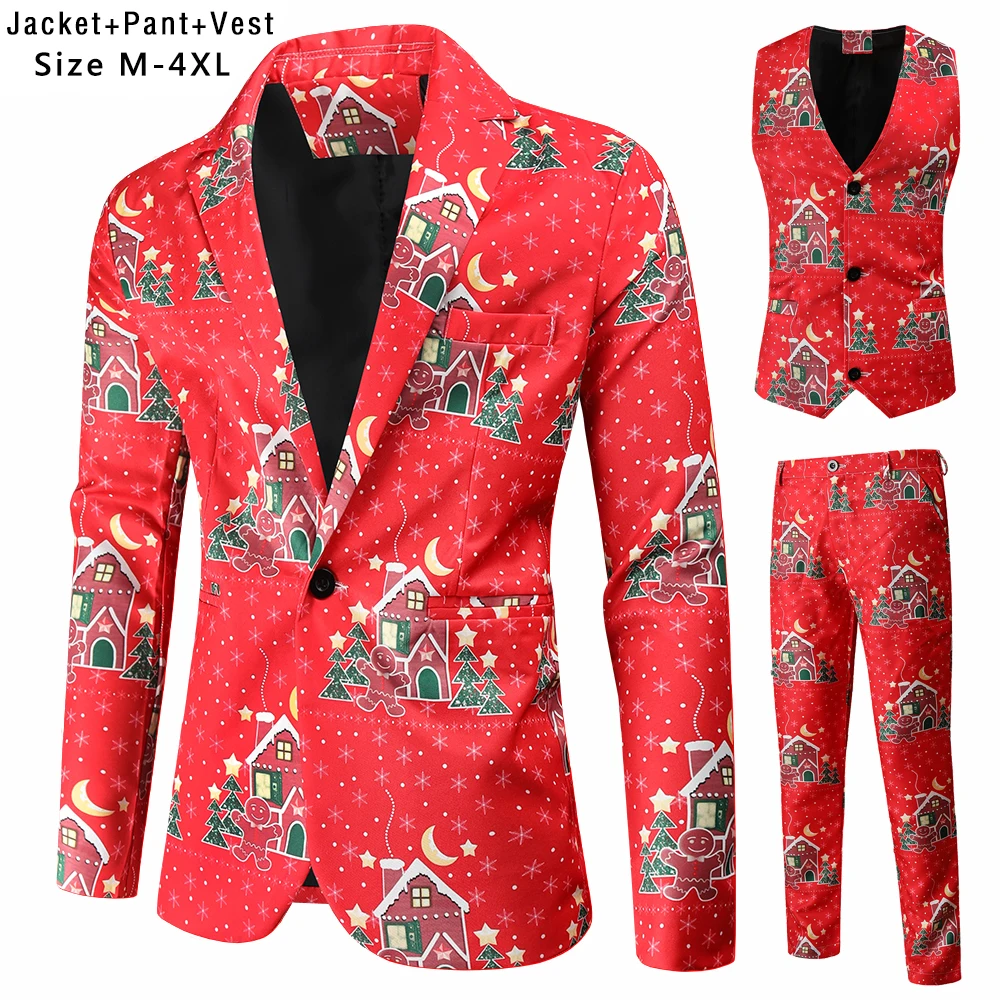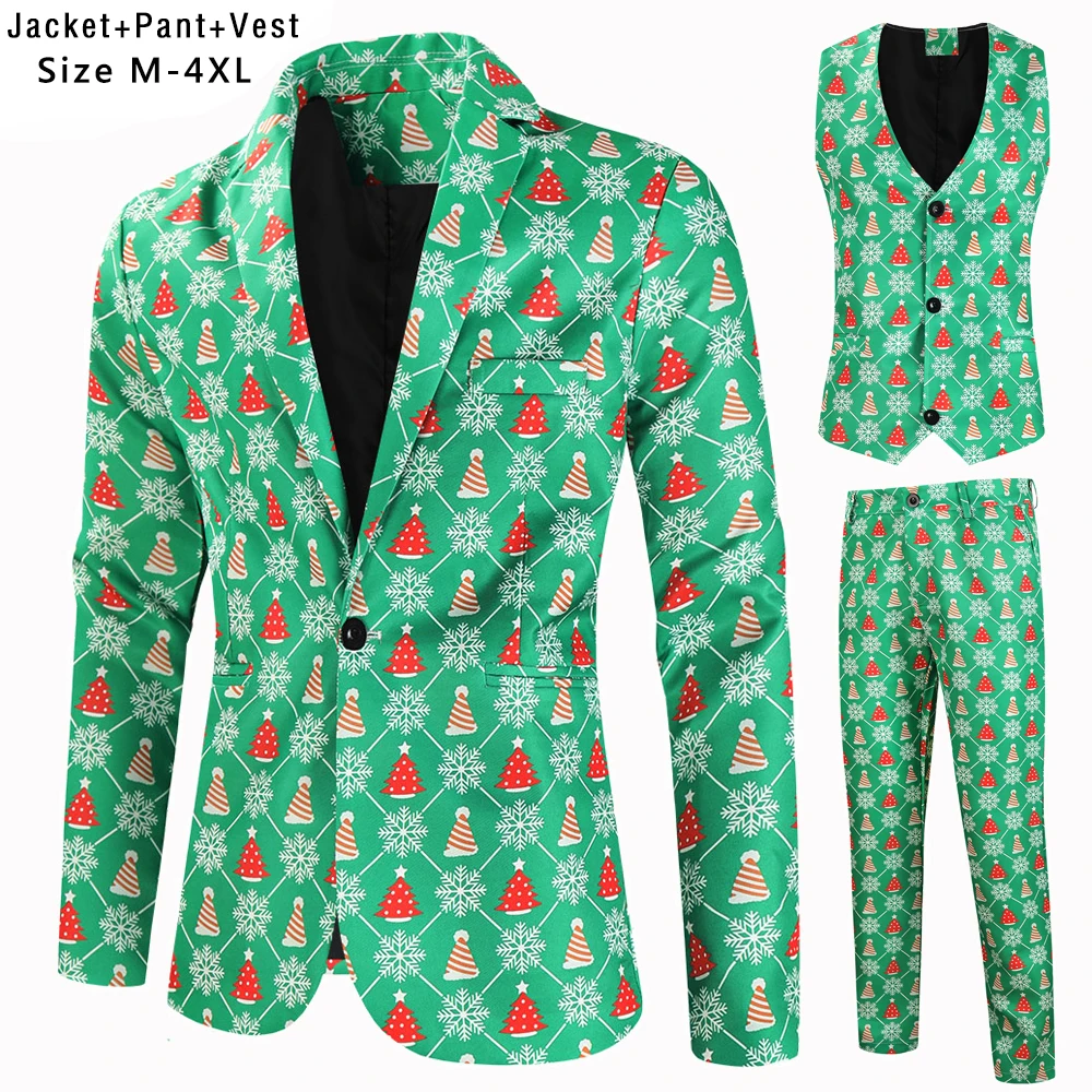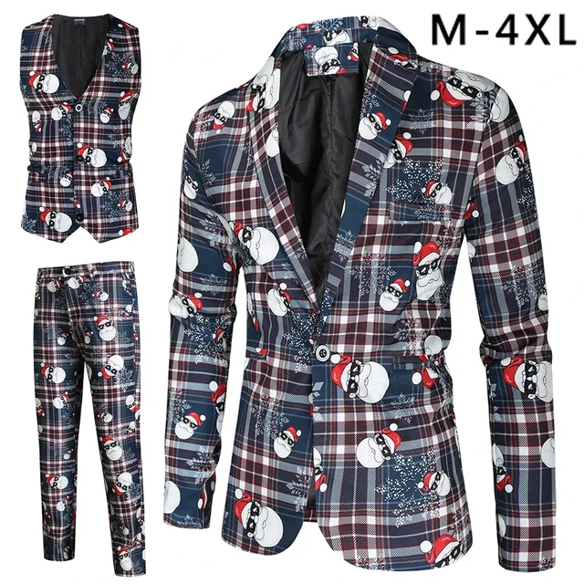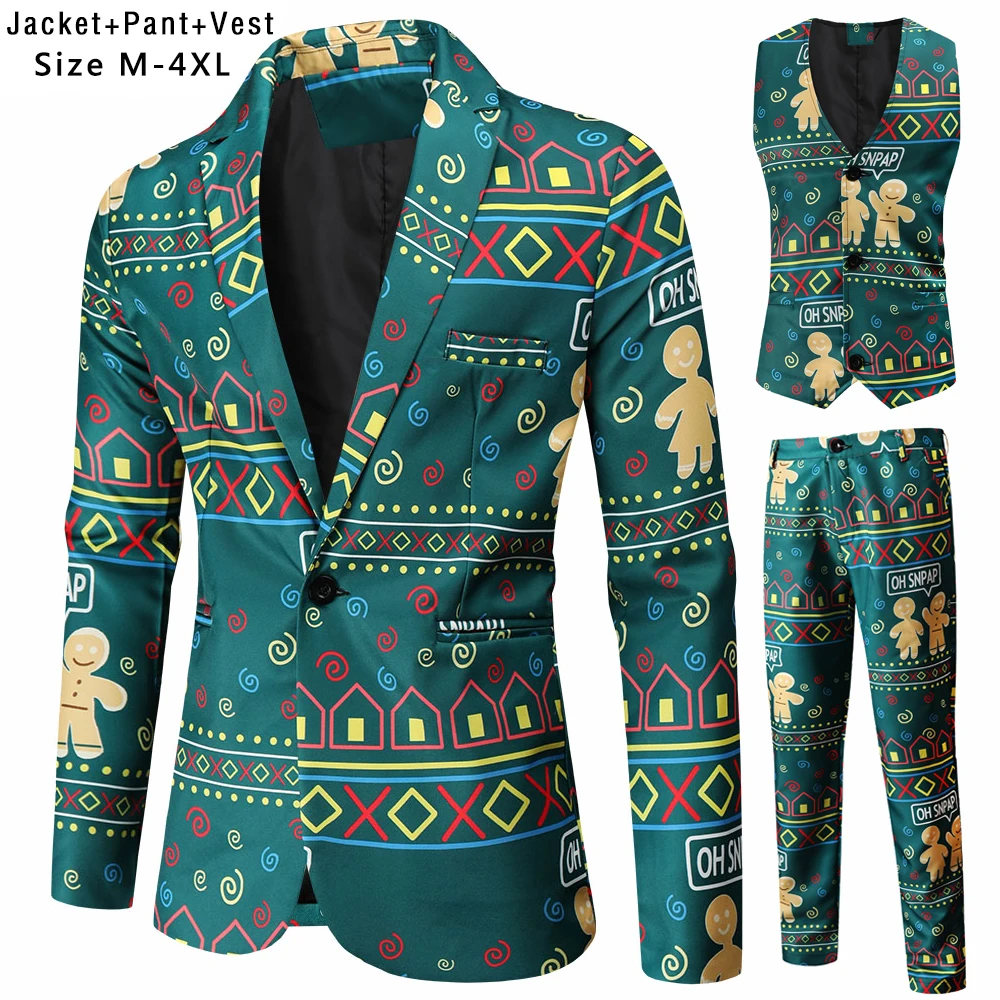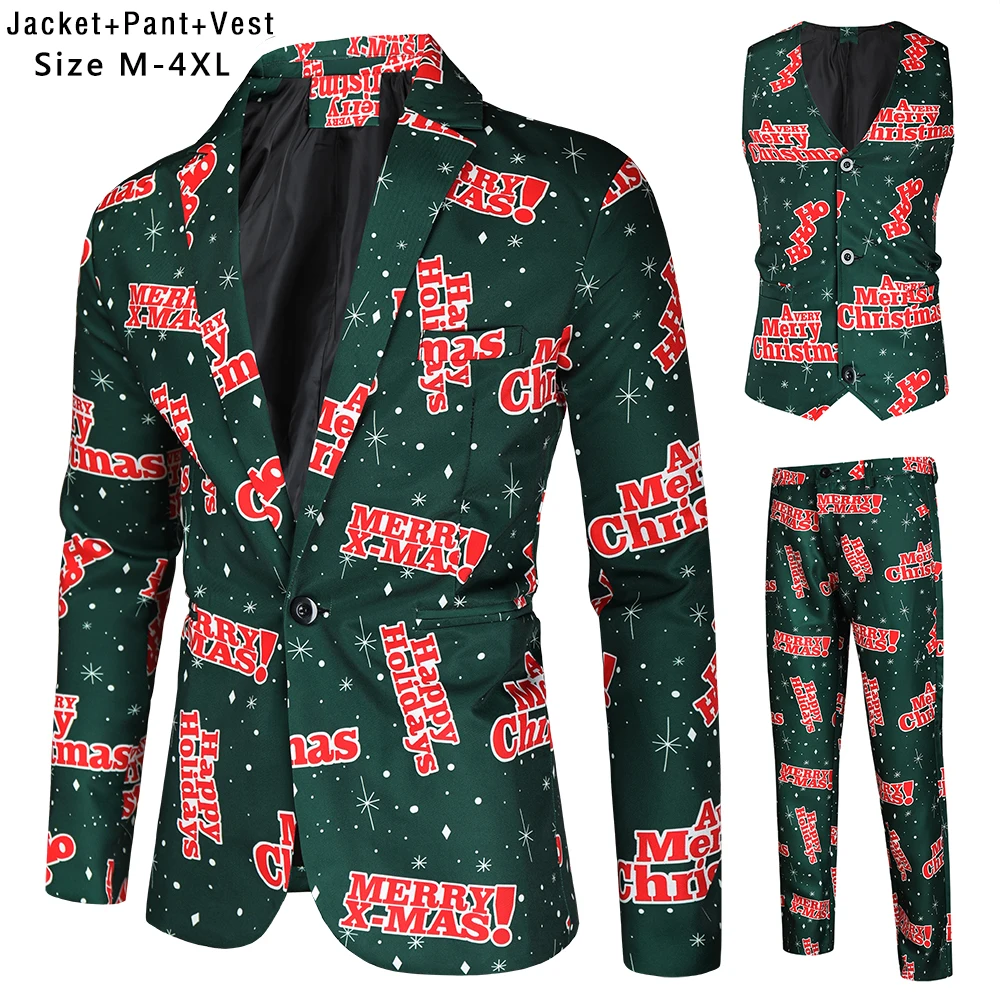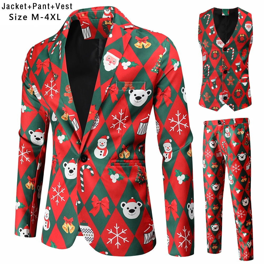 Plus Size 4XL Christmas Men 3 Piece Suits Fashion Sunglasses Santa Claus Printing Mens Sets Blazers Jacket