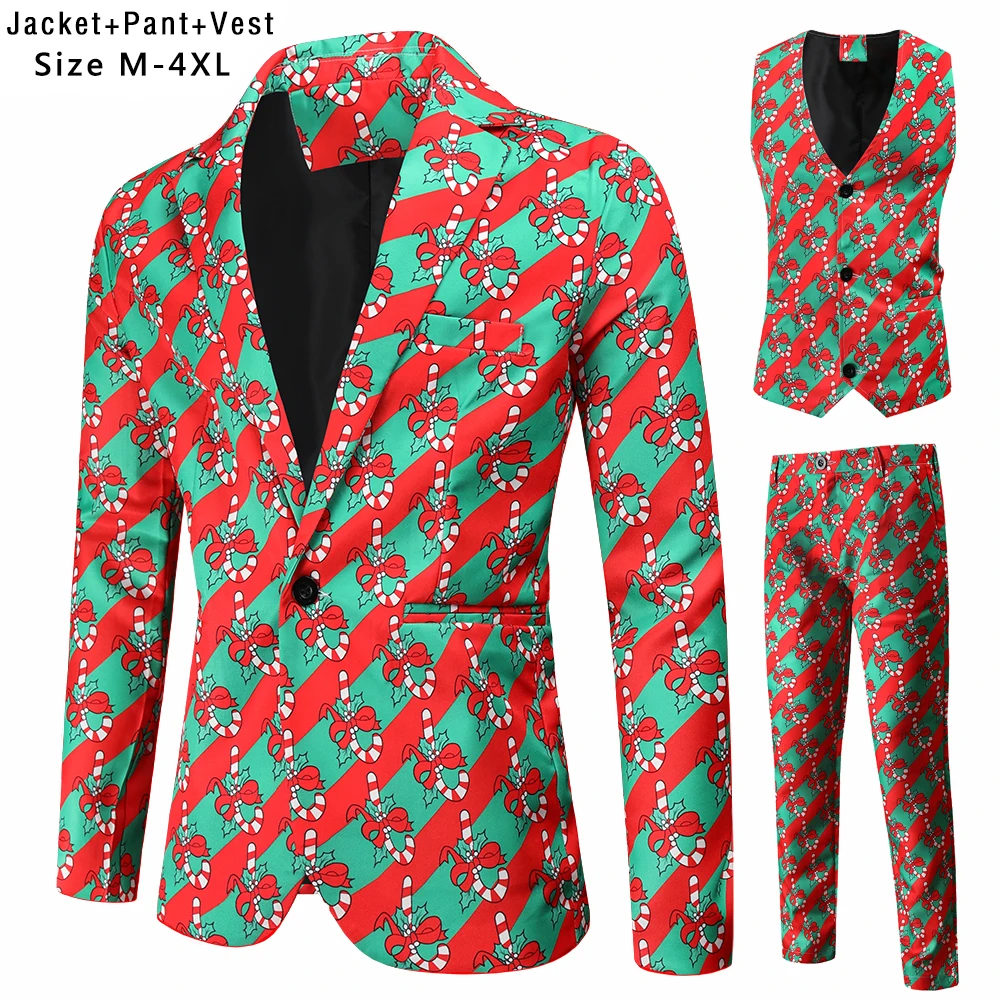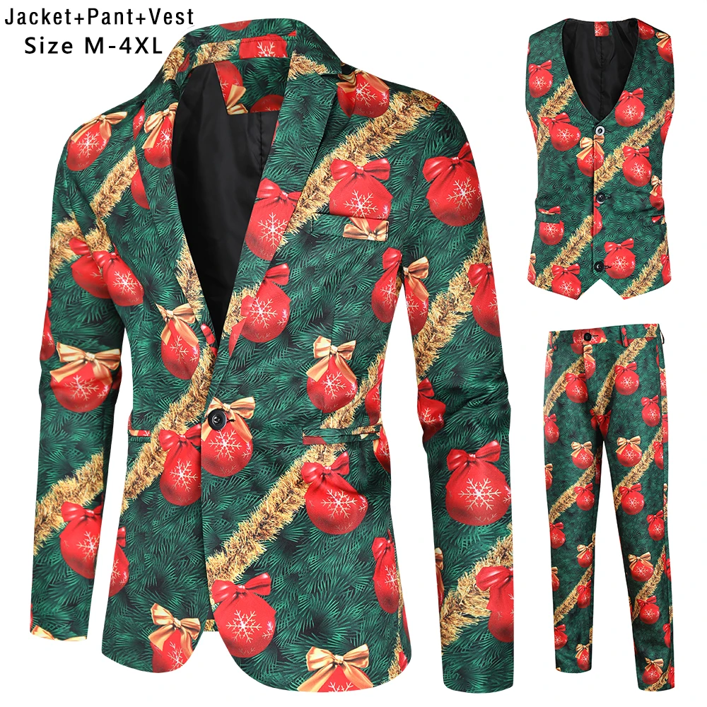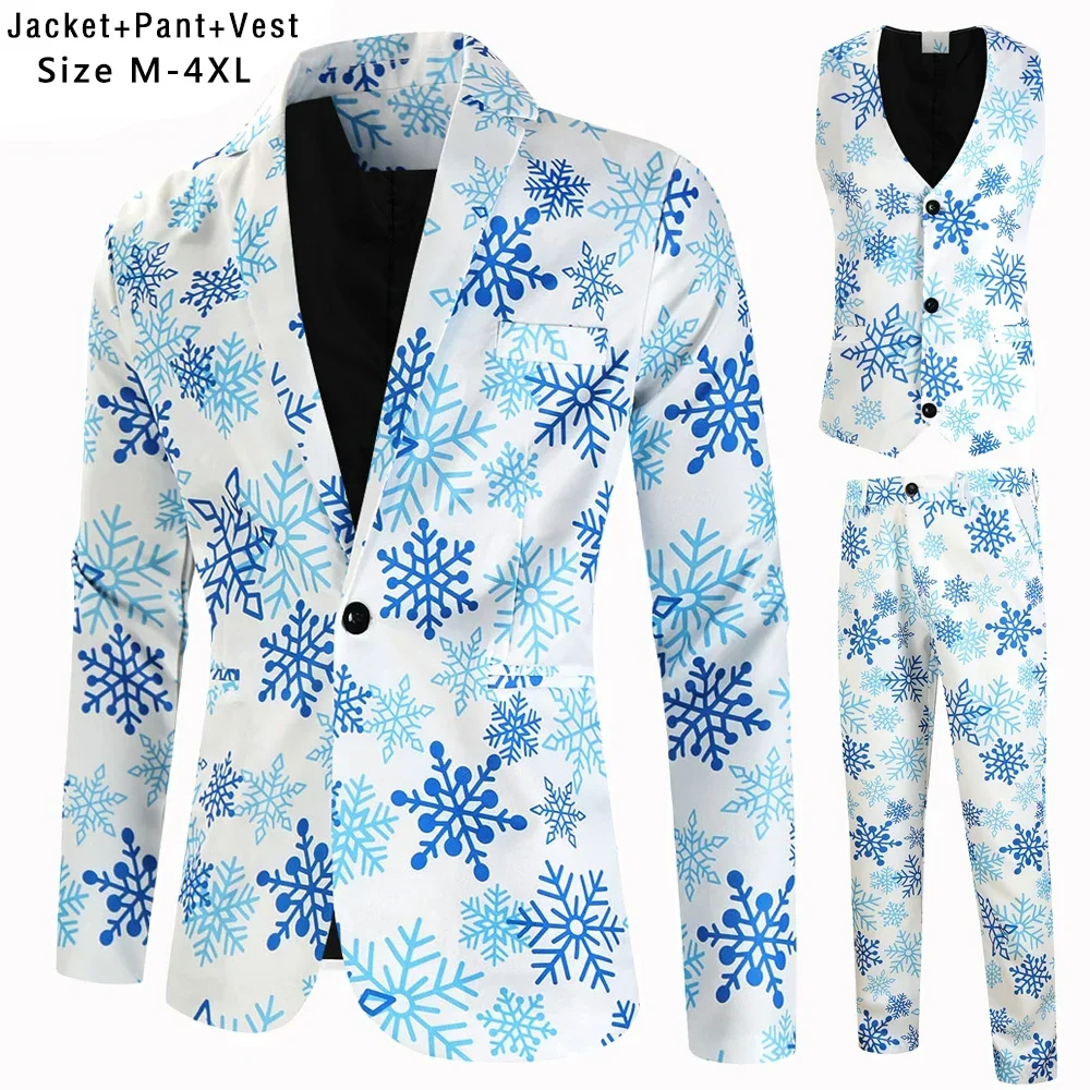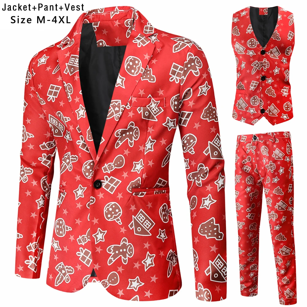Plus Size 4XL Christmas Men 3 Piece Suits Fashion Sunglasses Santa Claus Printing Mens Sets Blazers Jacket