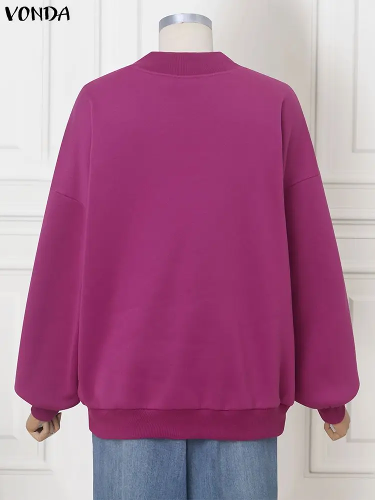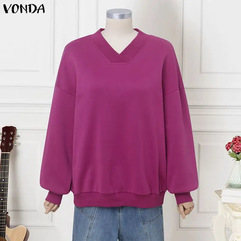 VONDA Fashion Elegant Women Sweatshirts Long Sleeve Solid Pullovers 2025 Autumn V-Neck Casual Jumpers Loose Shirts Plus Size 5XL