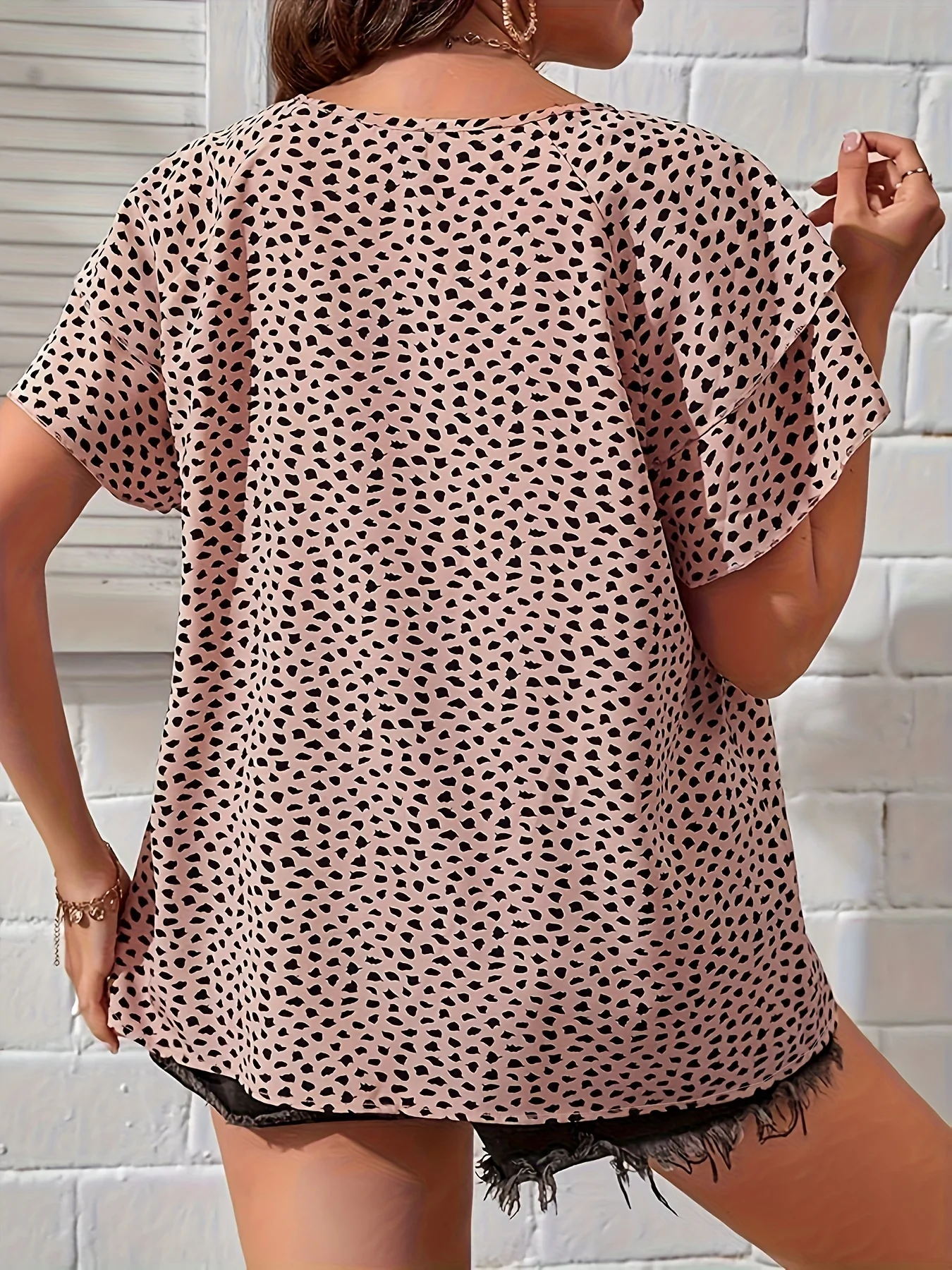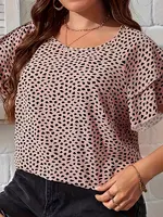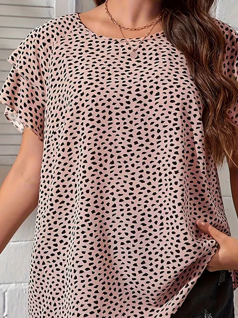 Plus Size All Over Print Crew Neck Blouse, Casual Ruffle Sleeve Blouse For Spring & Summer, Women’s