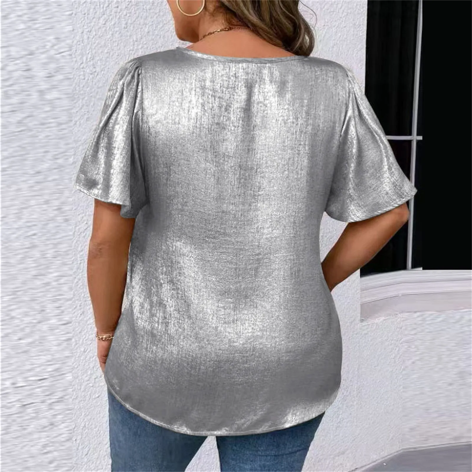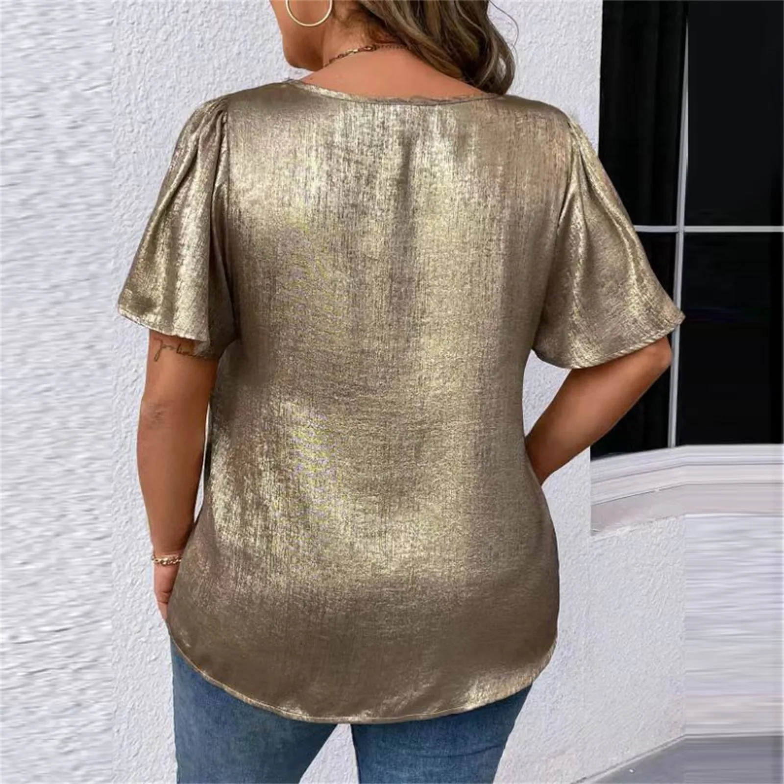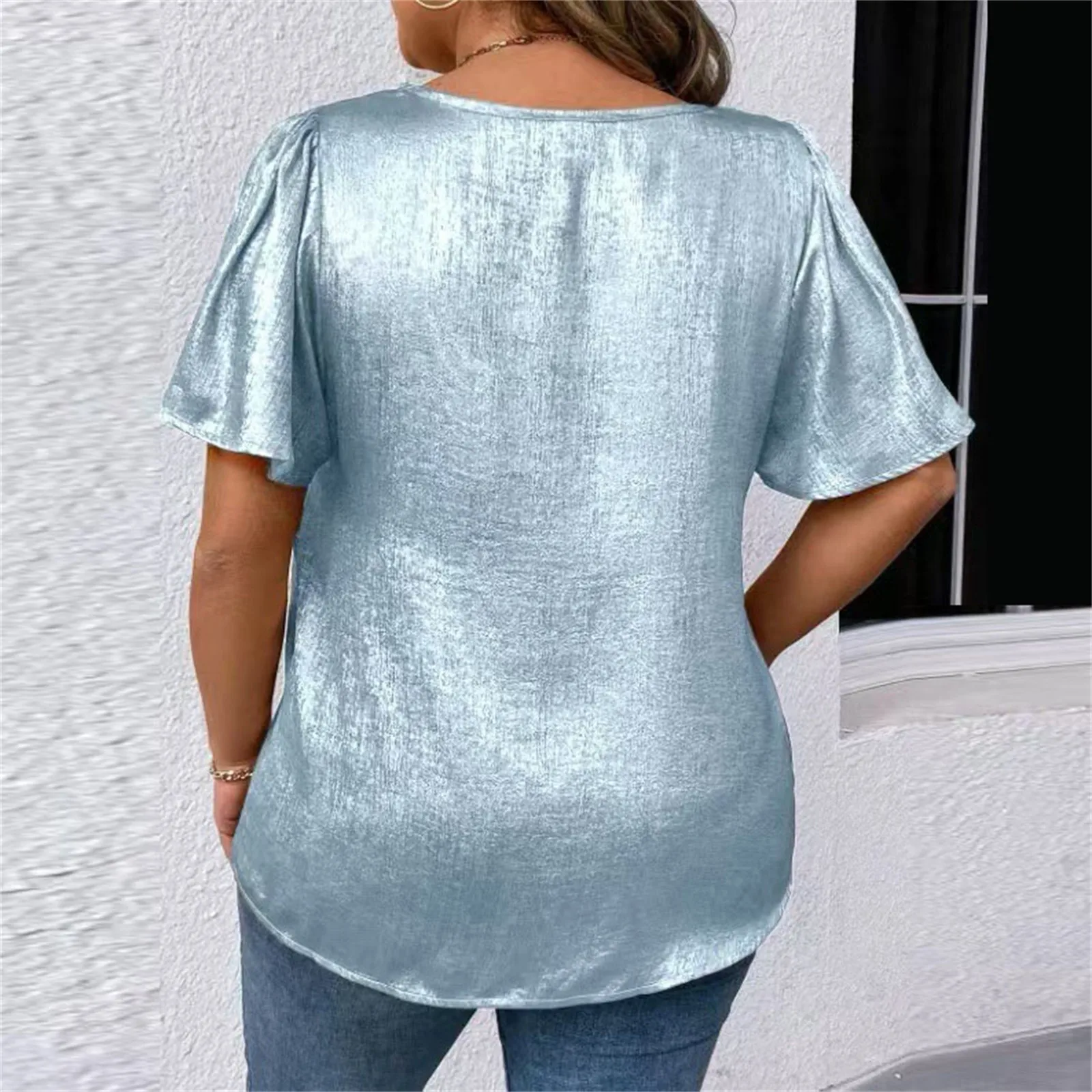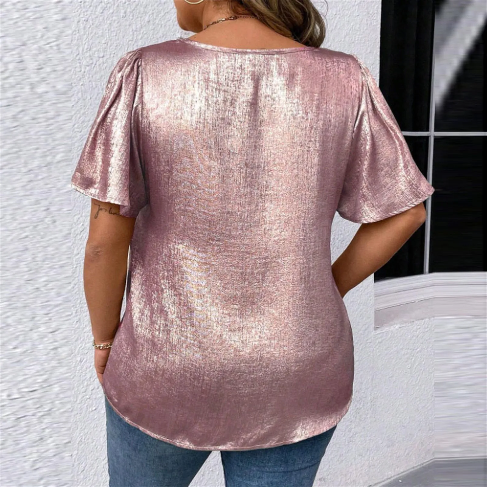 T Shirts For Women Pleated R-Neck Dressy Casual Blouses Printing Short Sleeve Summer Tops Loose Fit