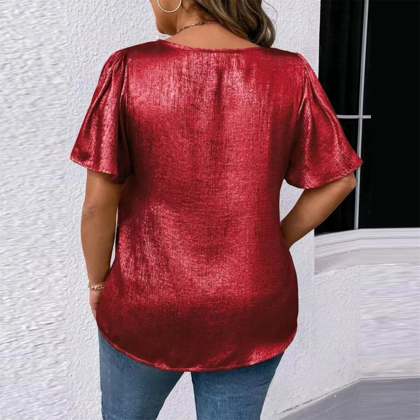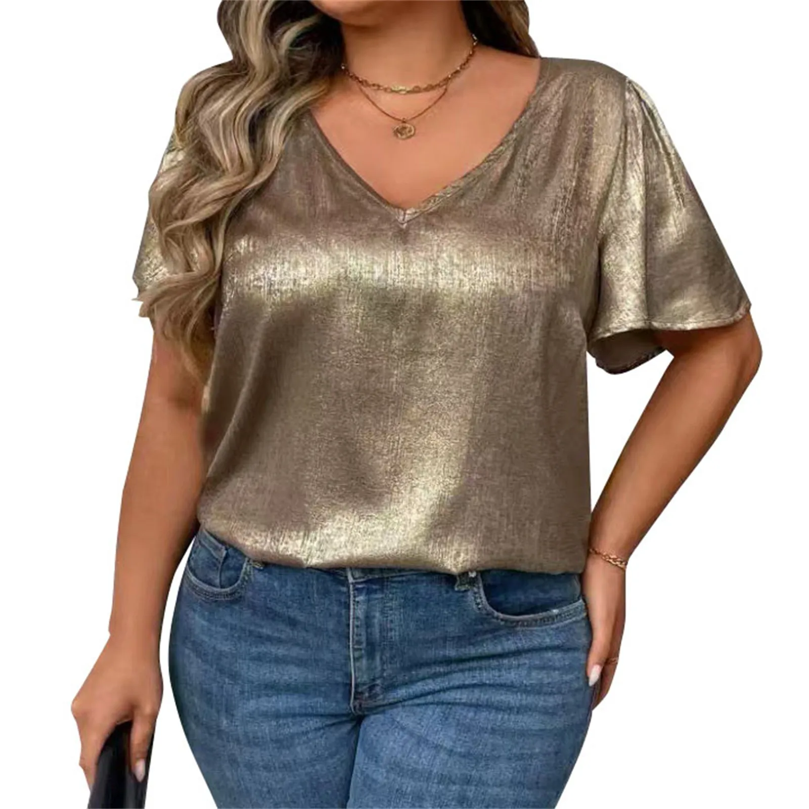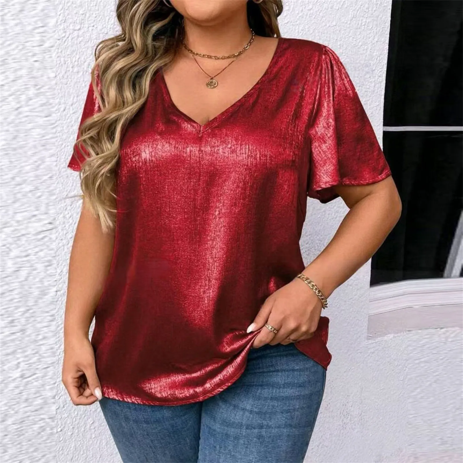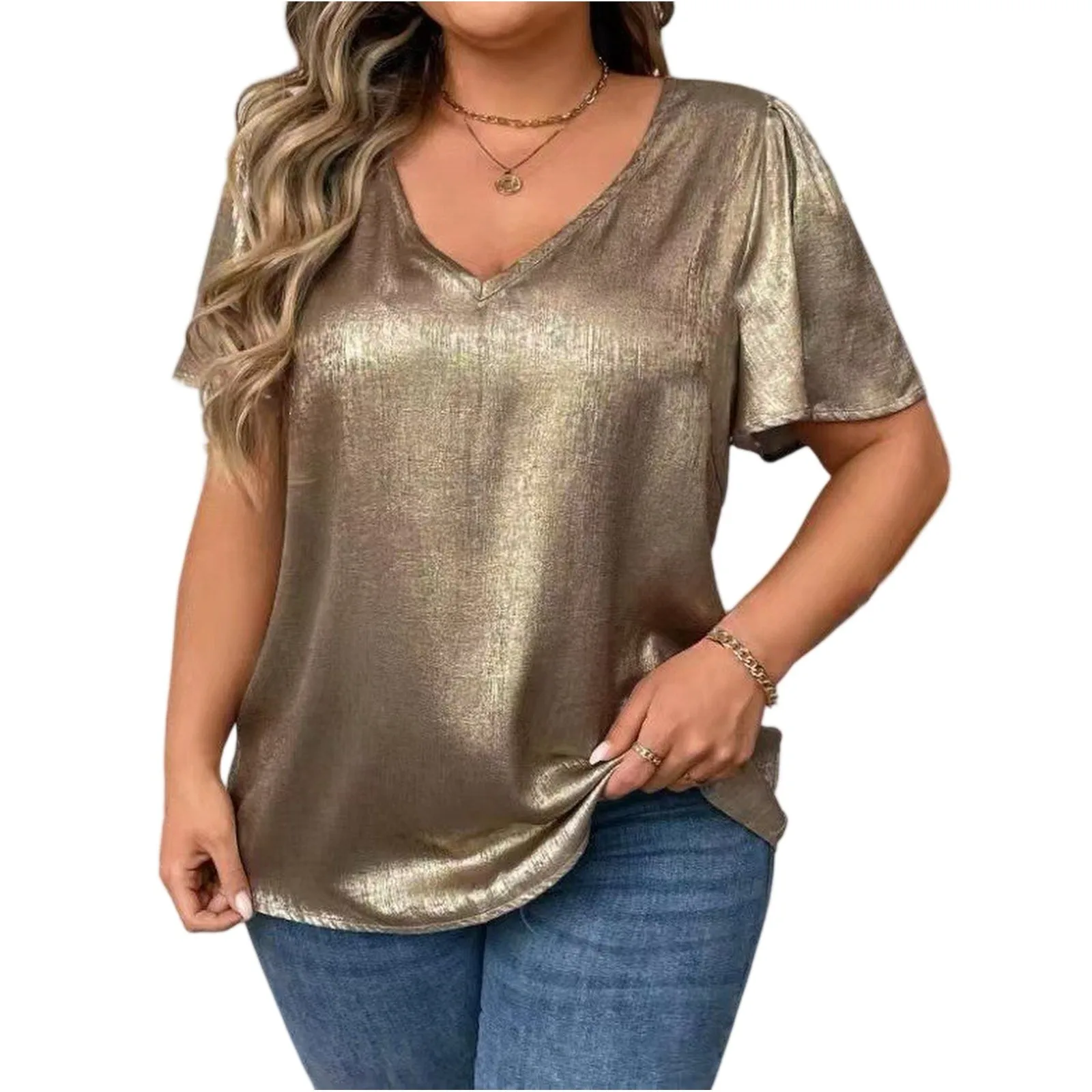 T Shirts For Women Pleated R-Neck Dressy Casual Blouses Printing Short Sleeve Summer Tops Loose Fit