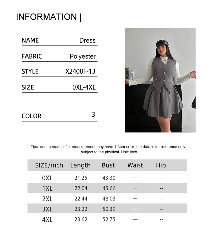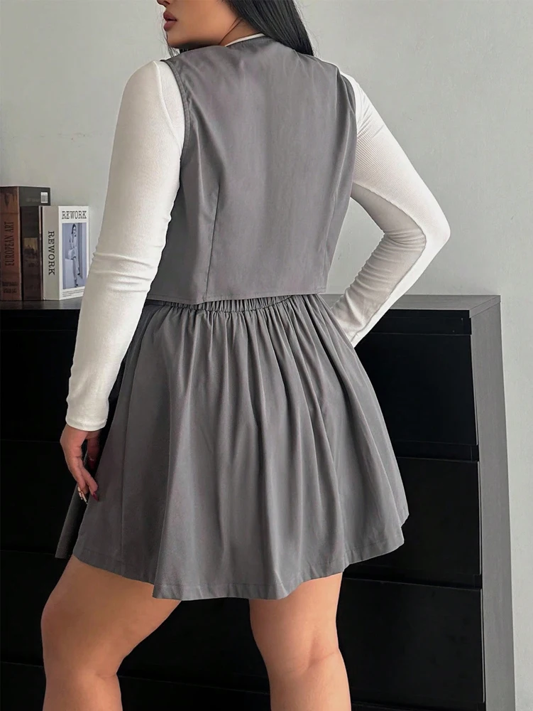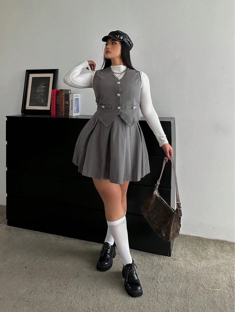 Plus Size College Style Suit Vest Pleated Skirt Two Piece Women’s Solid Color 2025 New Set Polyester