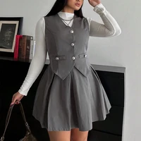 Plus Size College Style Suit Vest Pleated Skirt Two Piece Women’s Solid Color 2025 New Set Polyester