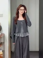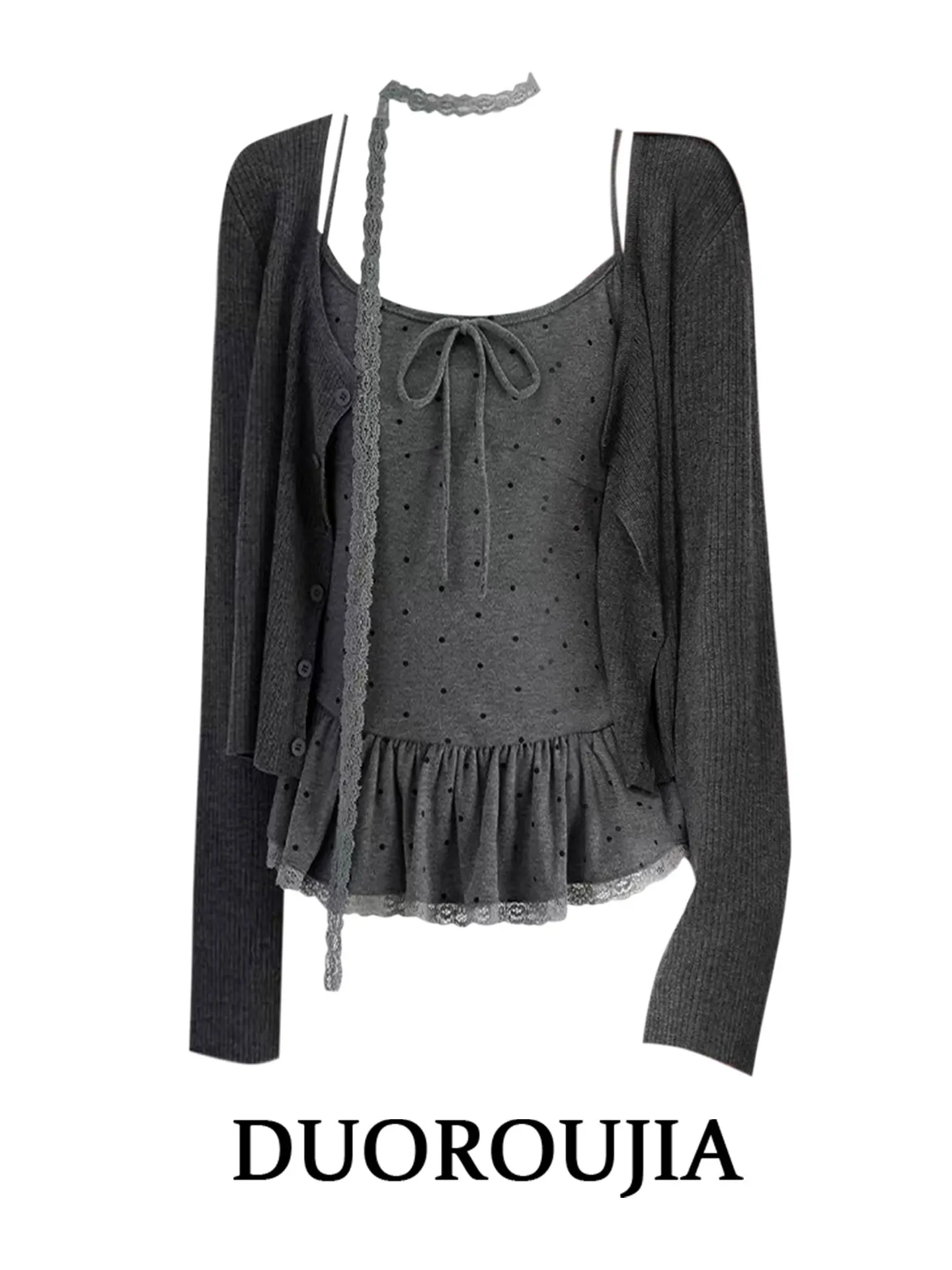 This two-piece set includes a top and a cardigan, providing versatility in your wardrobe.