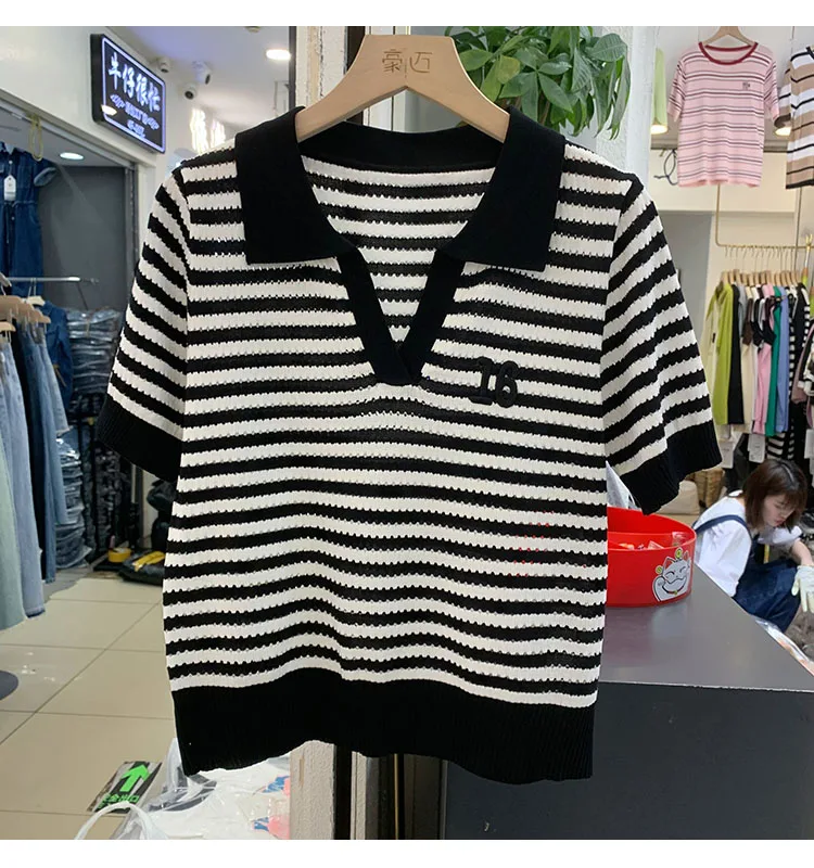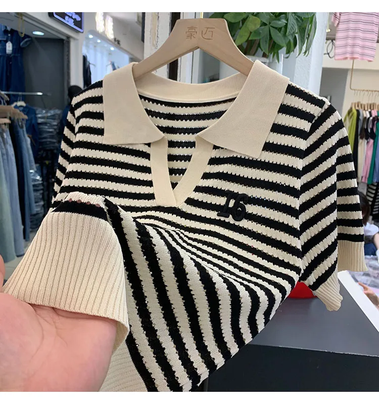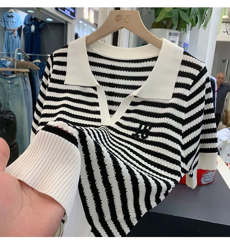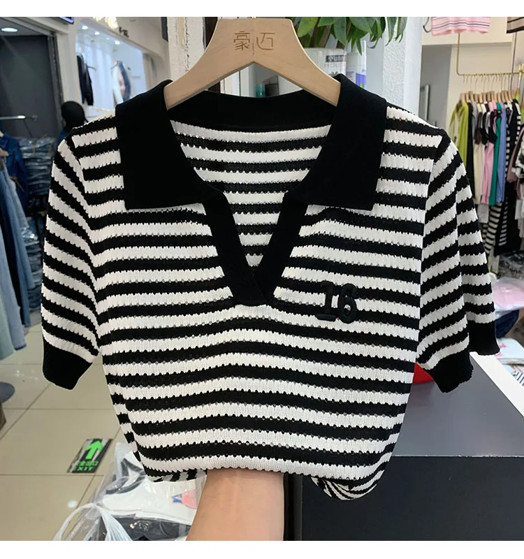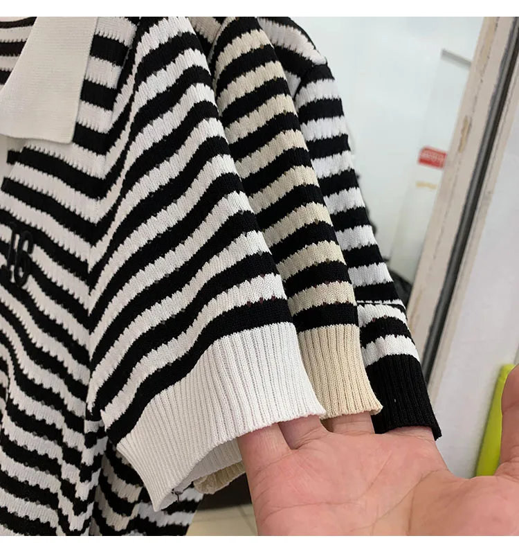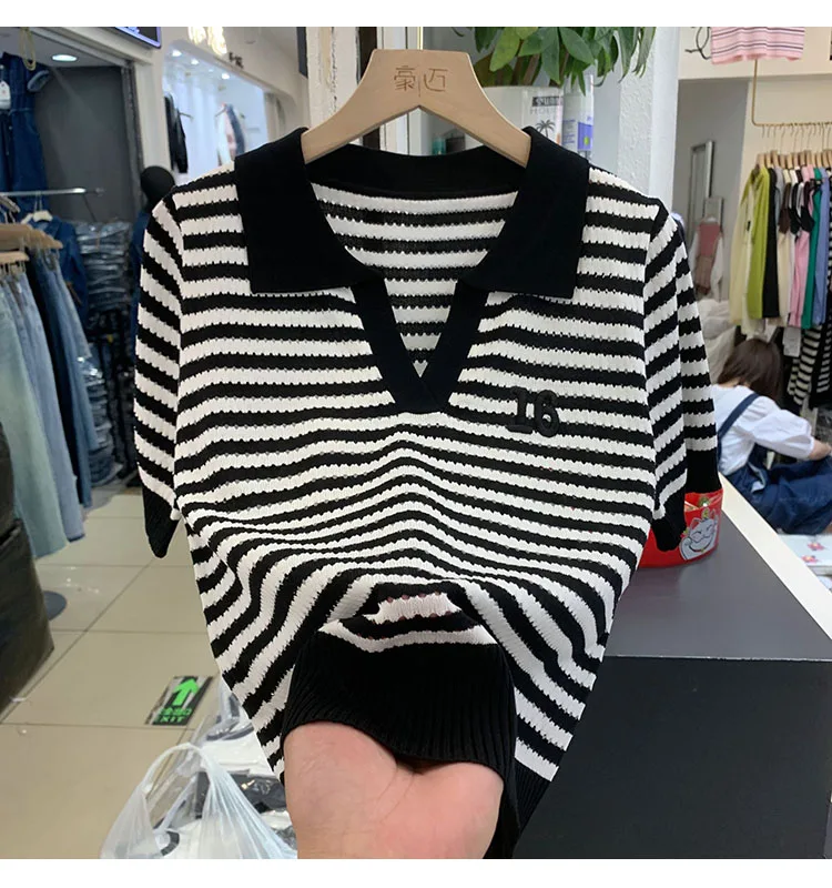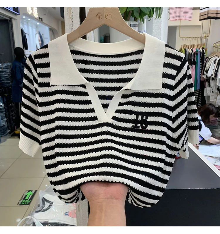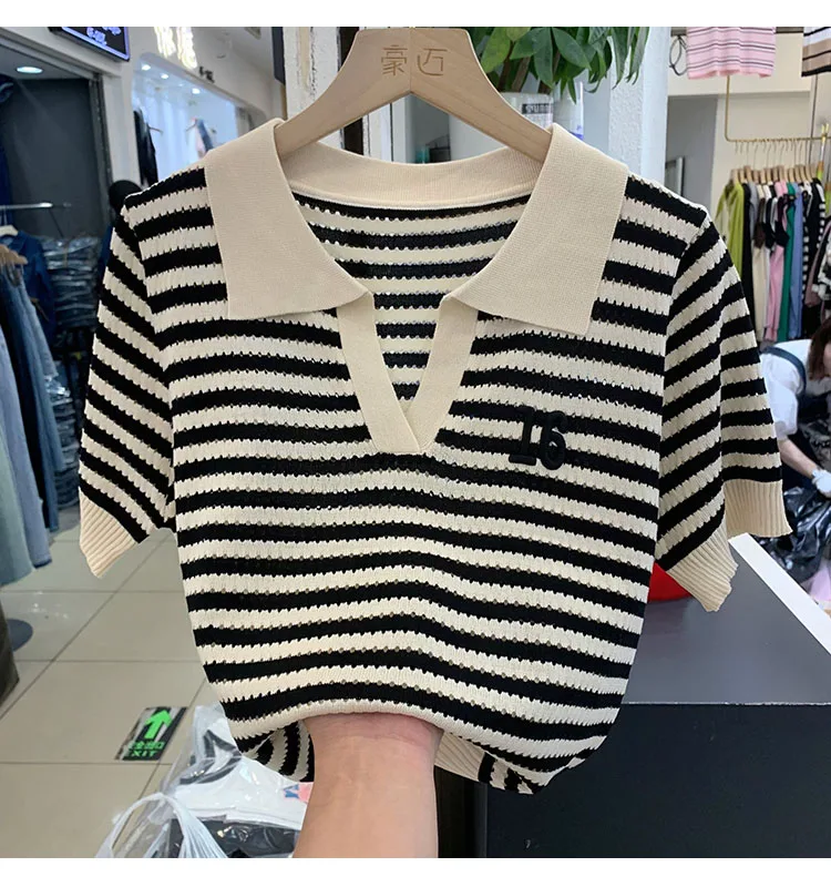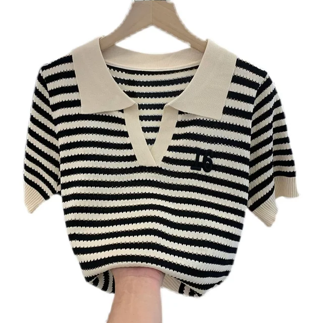 The striped pattern adds a touch of elegance and sophistication to this T-shirt, making it a versatile addition to any outfit.