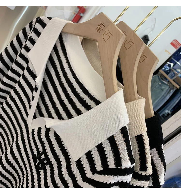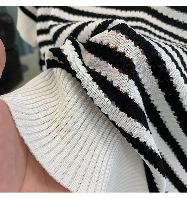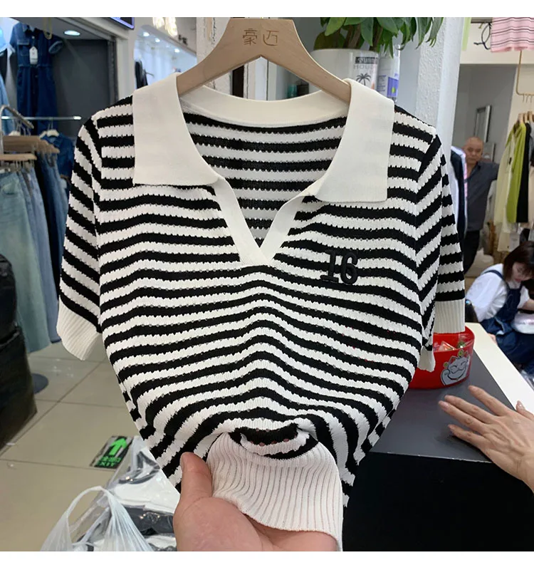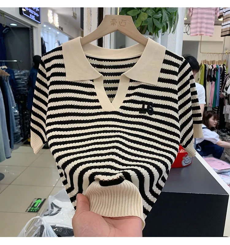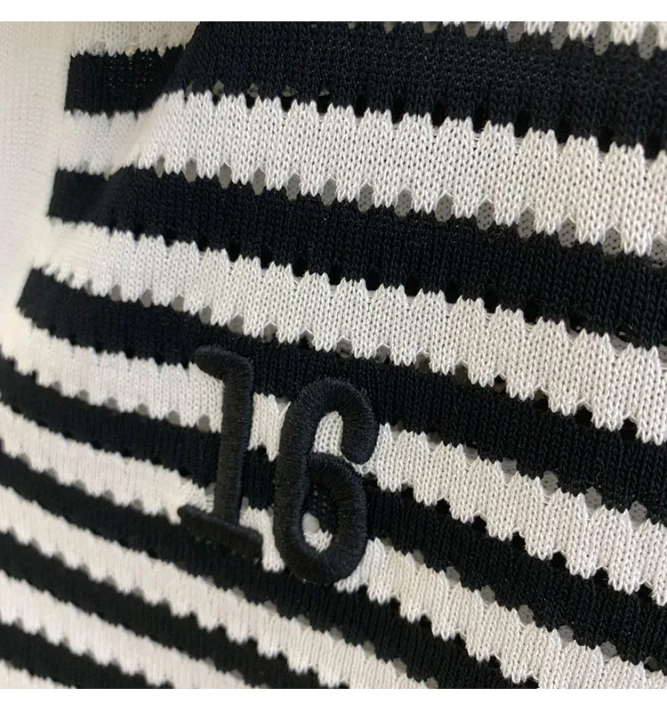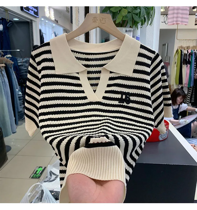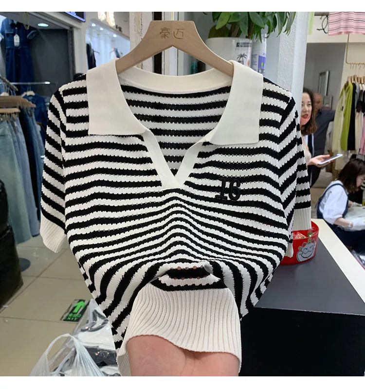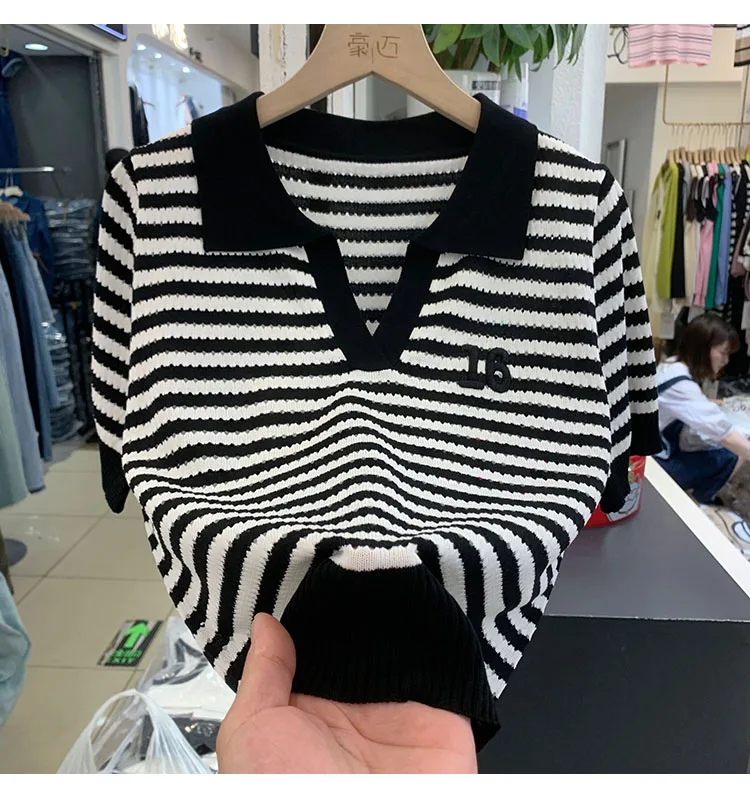 The striped pattern adds a touch of elegance and sophistication to this T-shirt, making it a versatile addition to any outfit.