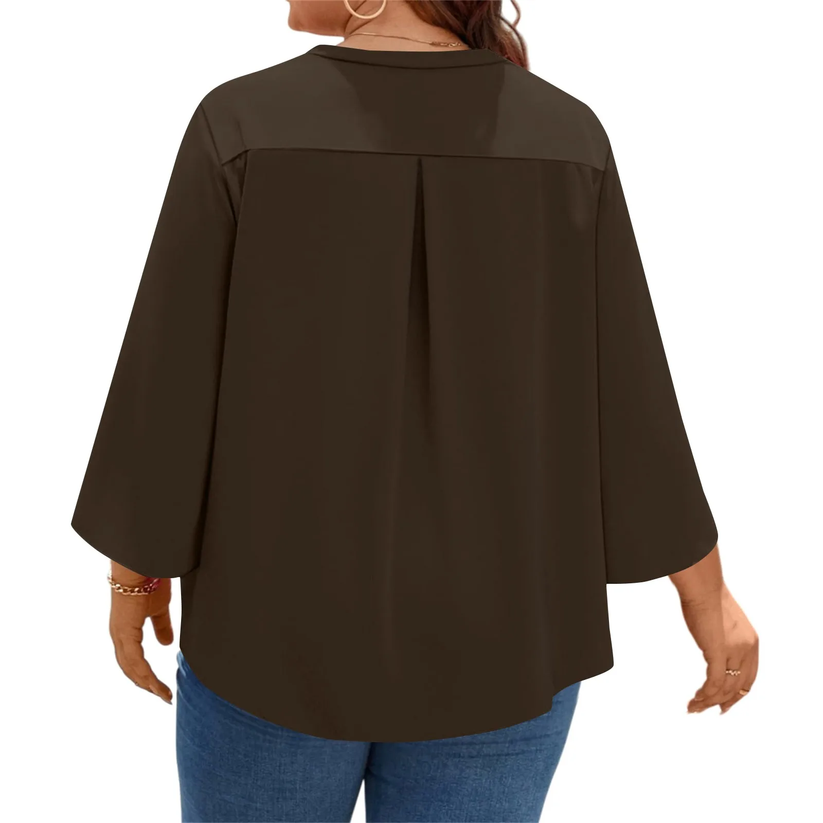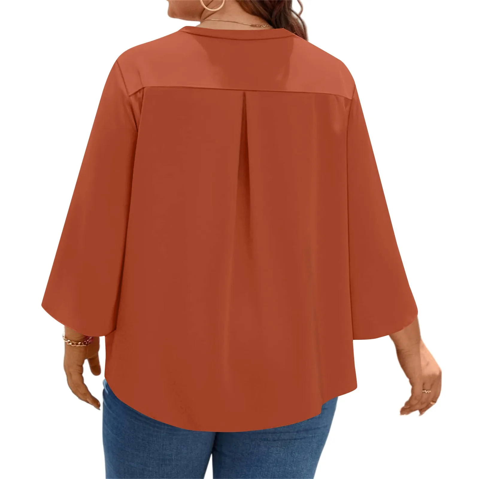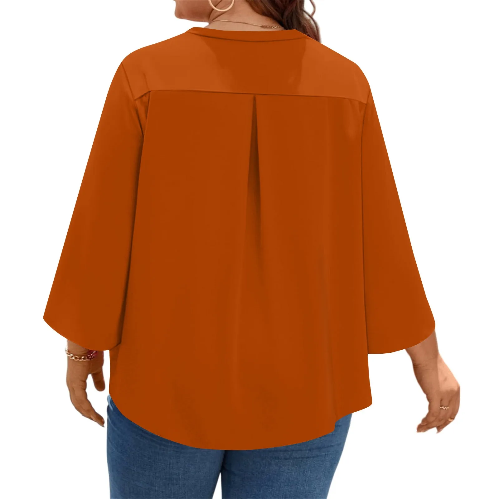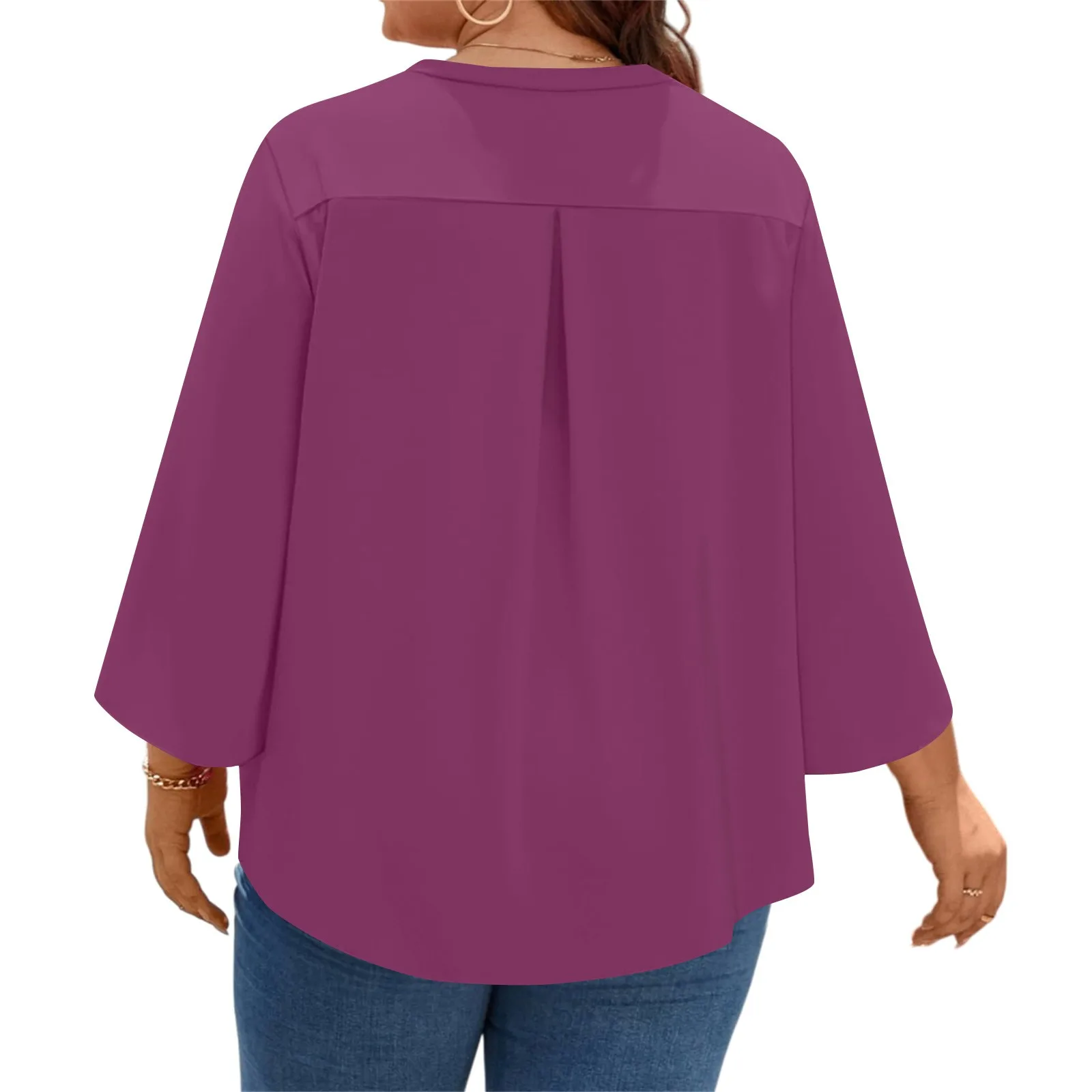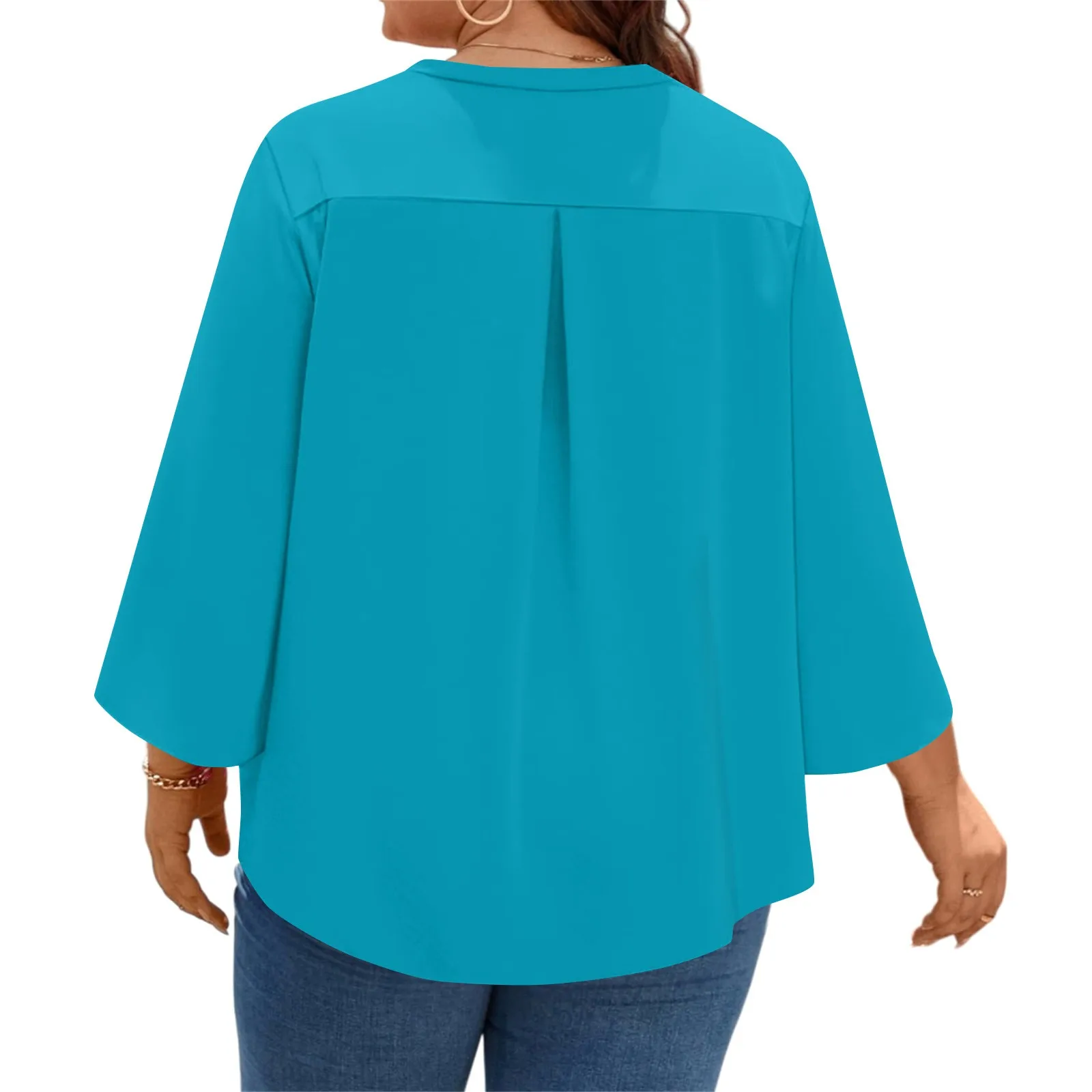 Women’s Solid Color V-neck Plus Size Tops 3/4 Sleeves Elegant Shirt Tops
