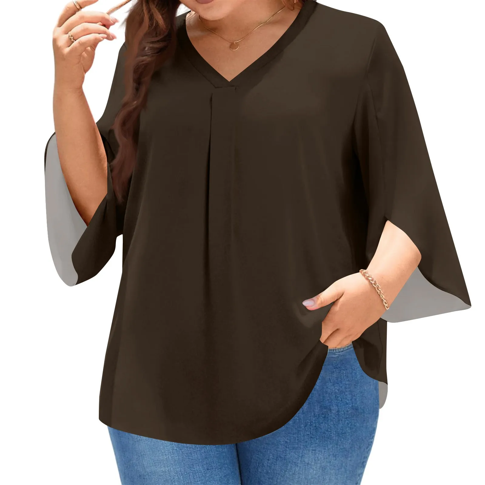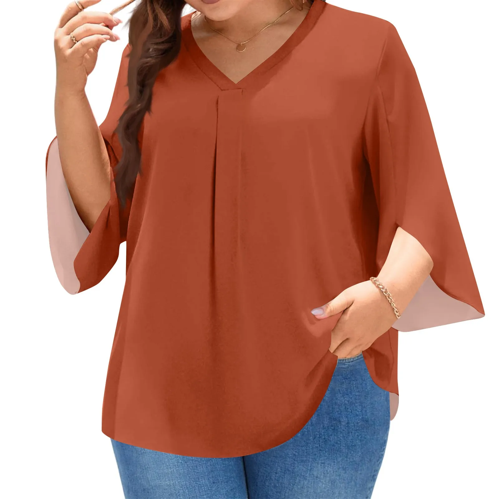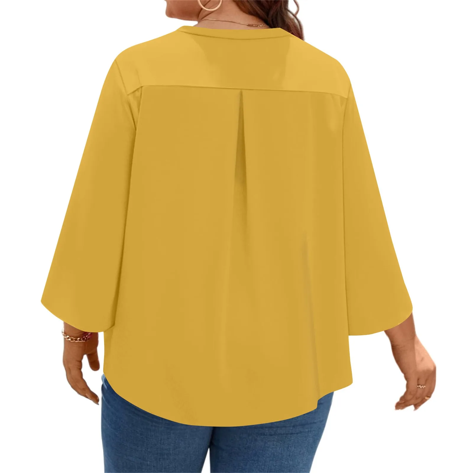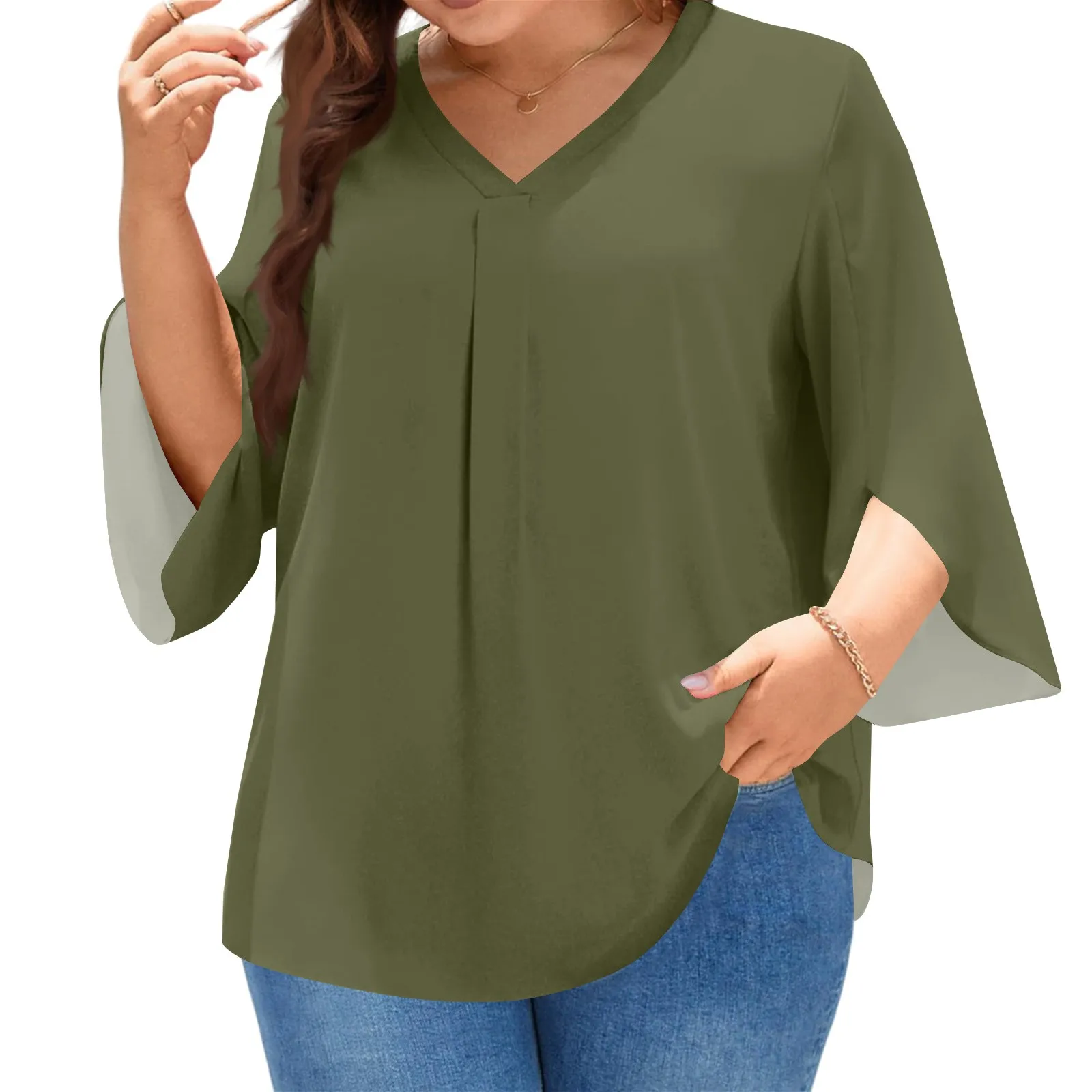 Women’s Solid Color V-neck Plus Size Tops 3/4 Sleeves Elegant Shirt Tops