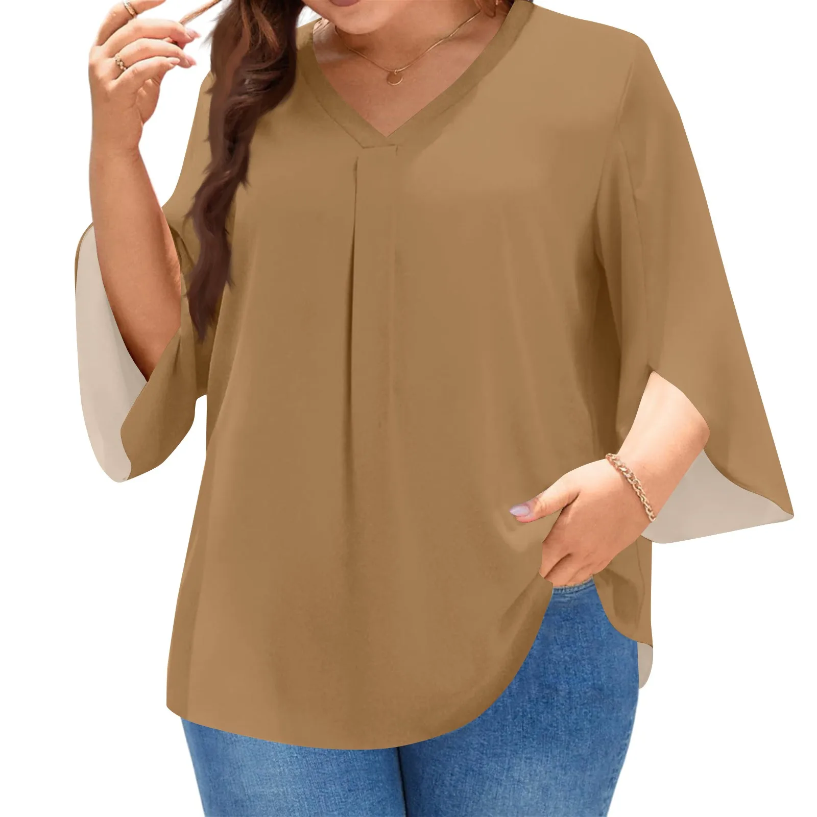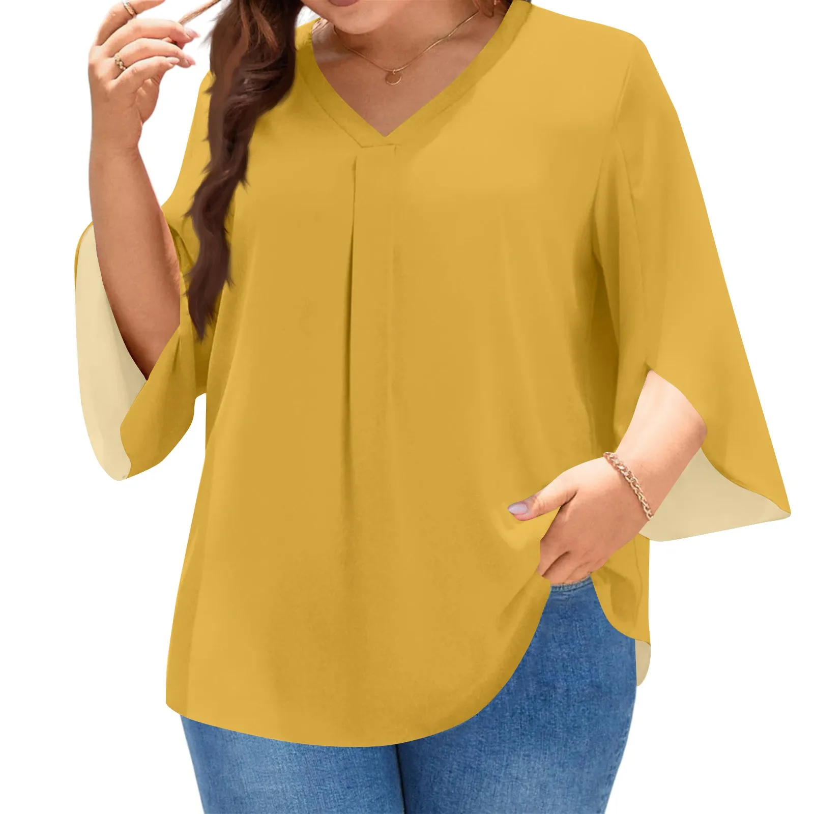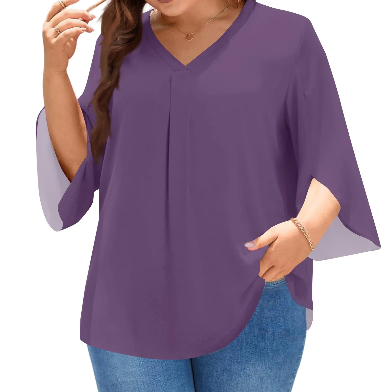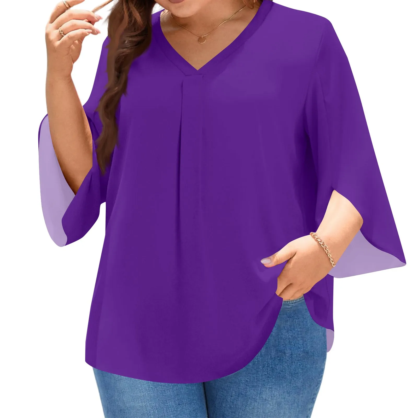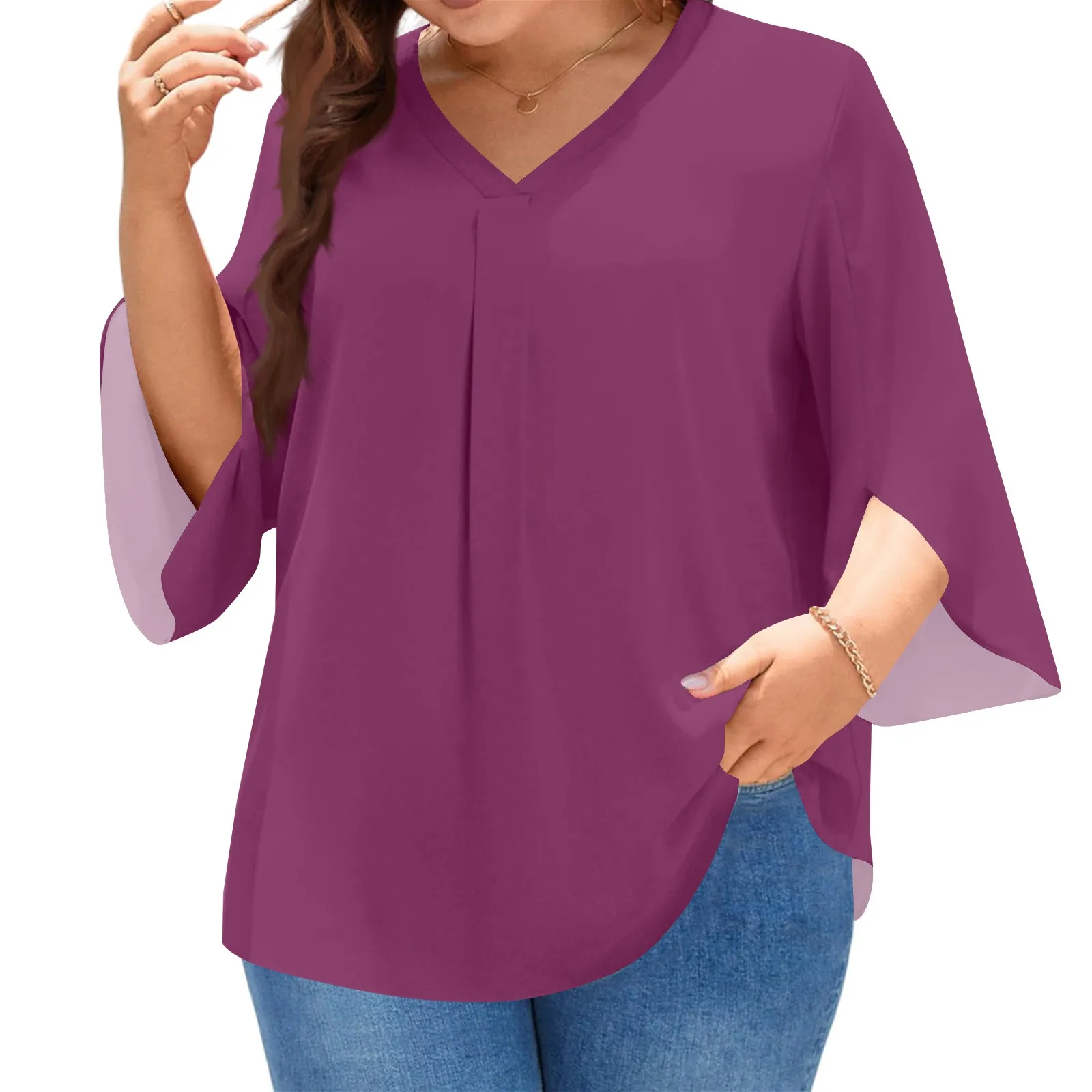 Women’s Solid Color V-neck Plus Size Tops 3/4 Sleeves Elegant Shirt Tops