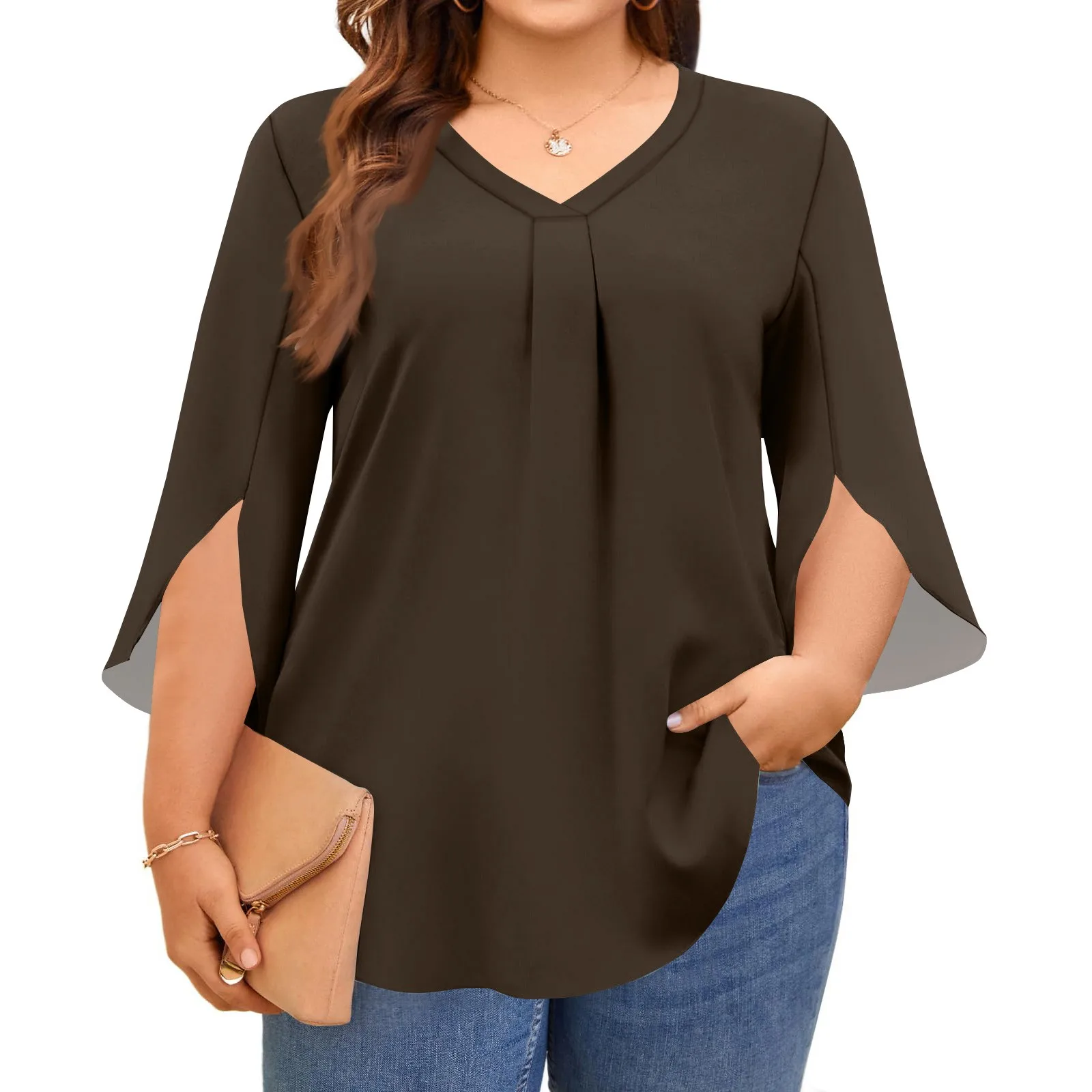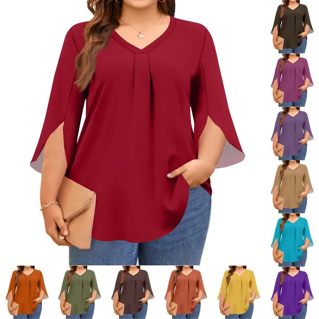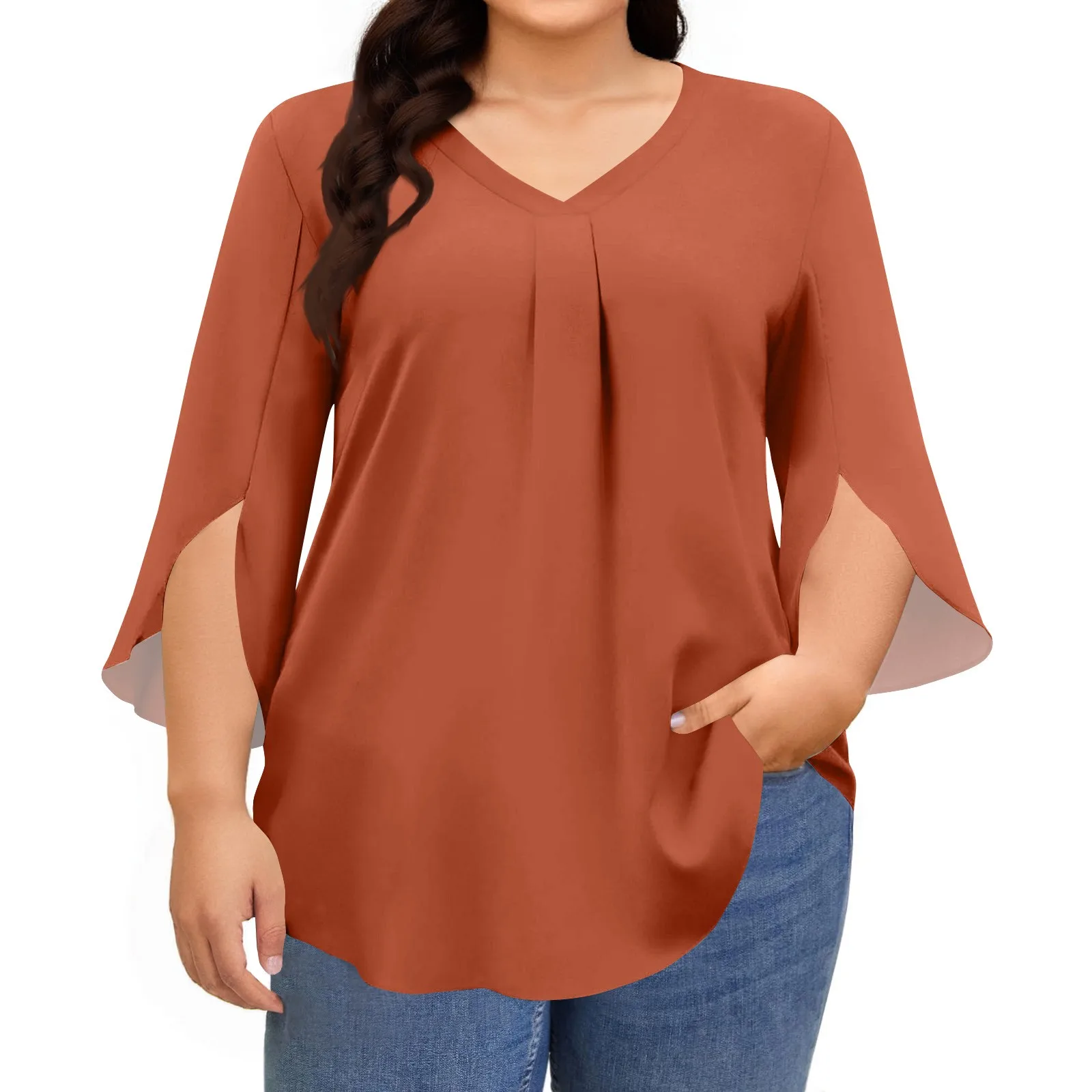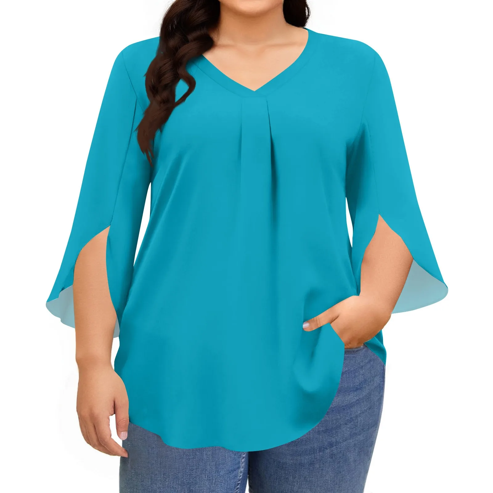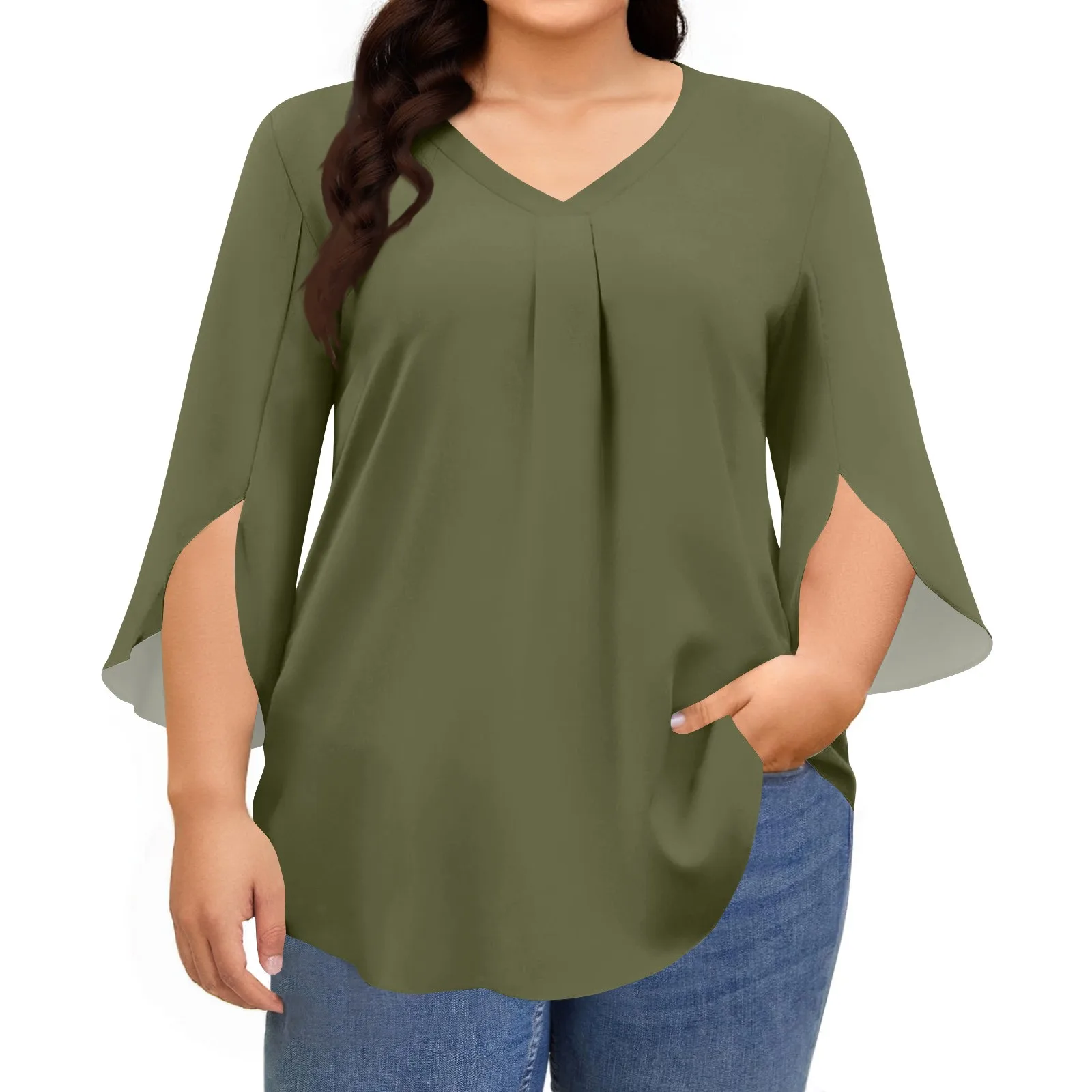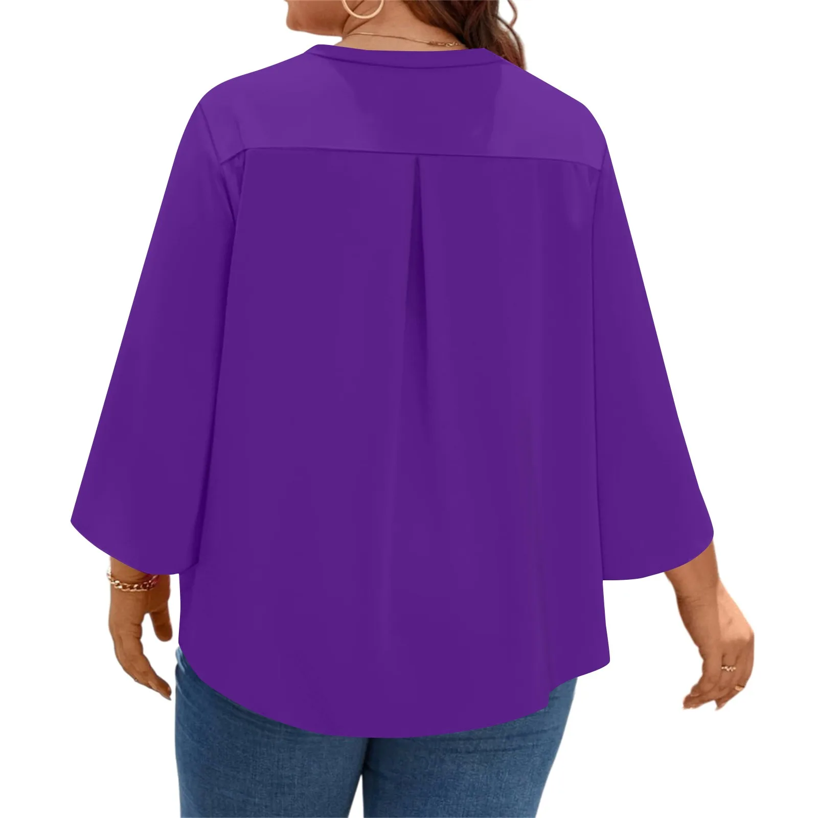 Women’s Solid Color V-neck Plus Size Tops 3/4 Sleeves Elegant Shirt Tops