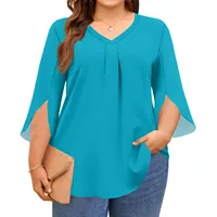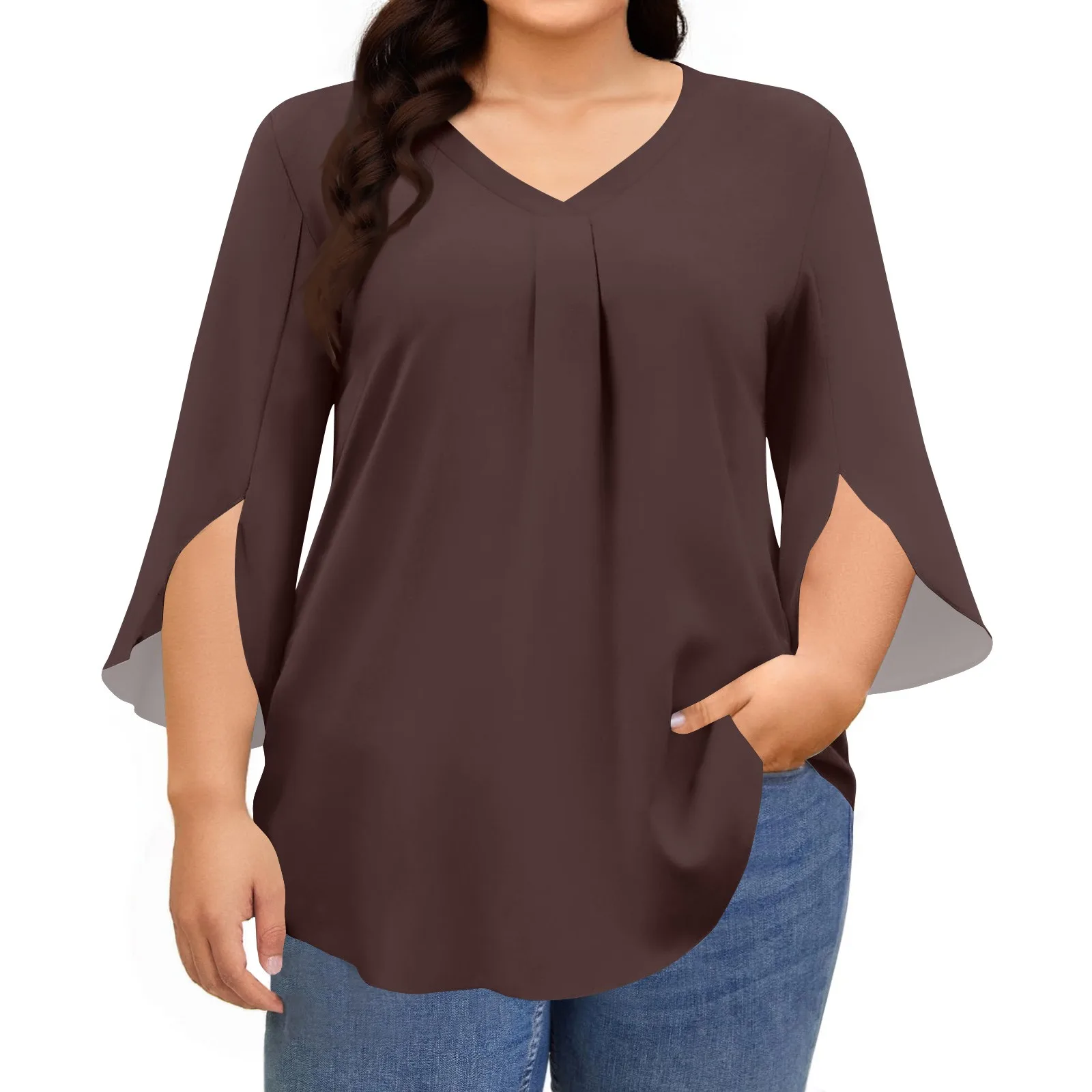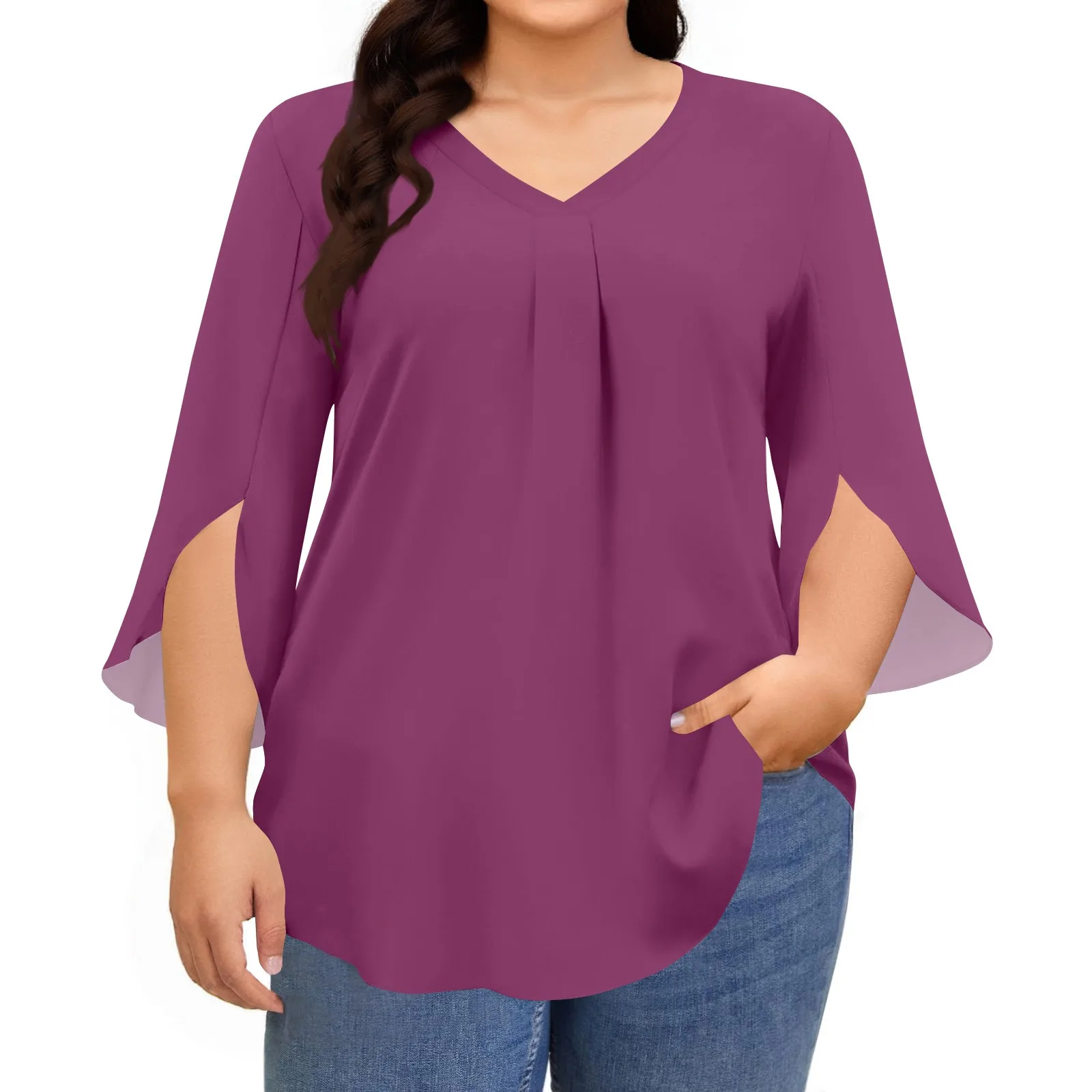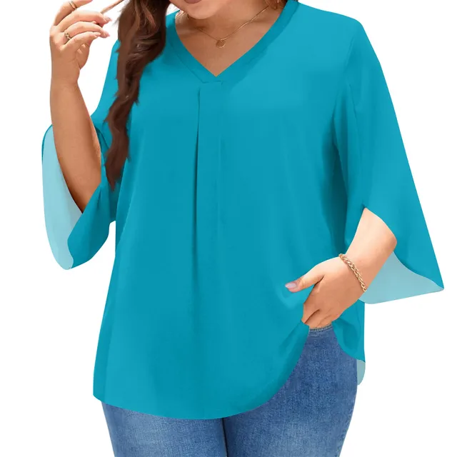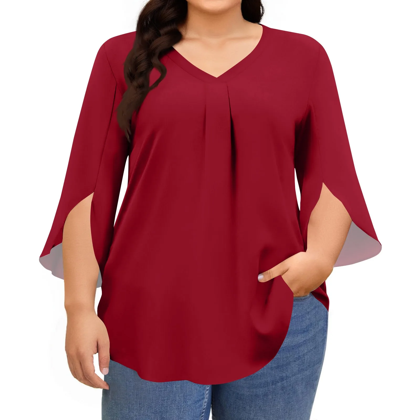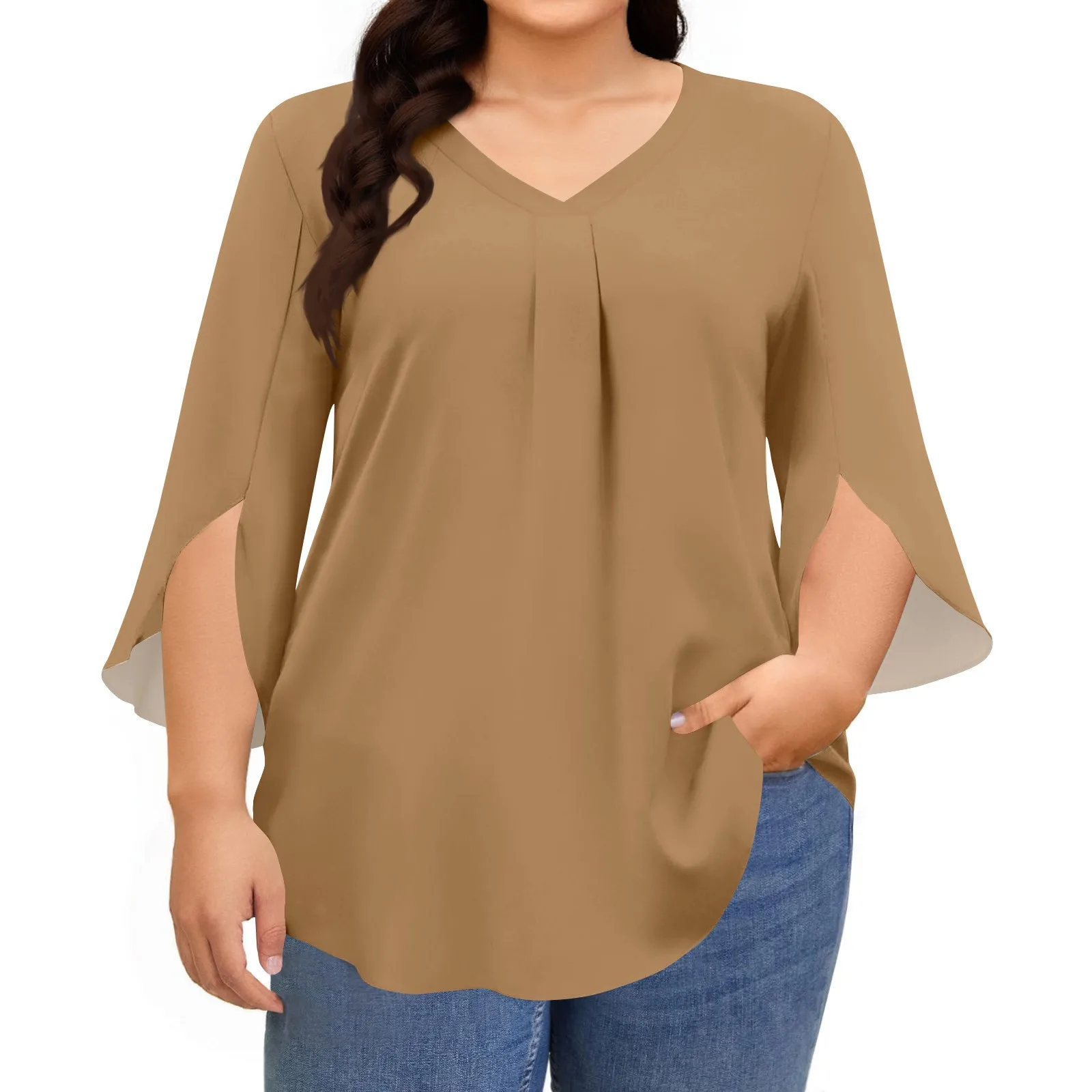 Women’s Solid Color V-neck Plus Size Tops 3/4 Sleeves Elegant Shirt Tops