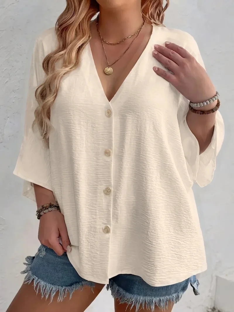 Plus Size Woman Casual T-shirt Solid Color Breathable Spring/summer V-neck Button Travel Wear with European