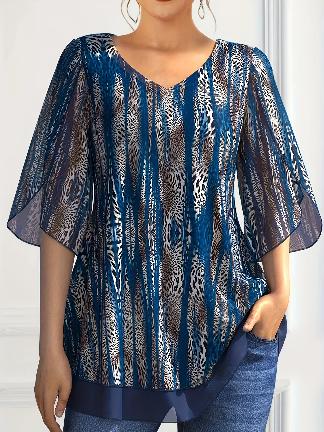 -56%Plus Size Women Chiffon T Shirt V-Neck Half Sleeve Summer Loose Casual Vintage Printing Elegant Office Lady Tee Top for Female