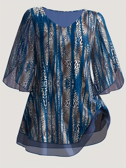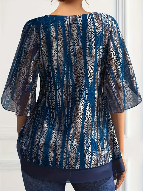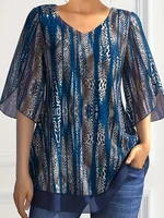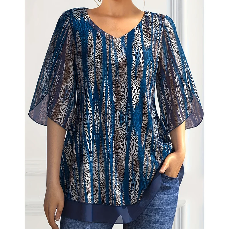 -56%Plus Size Women Chiffon T Shirt V-Neck Half Sleeve Summer Loose Casual Vintage Printing Elegant Office Lady Tee Top for Female