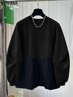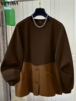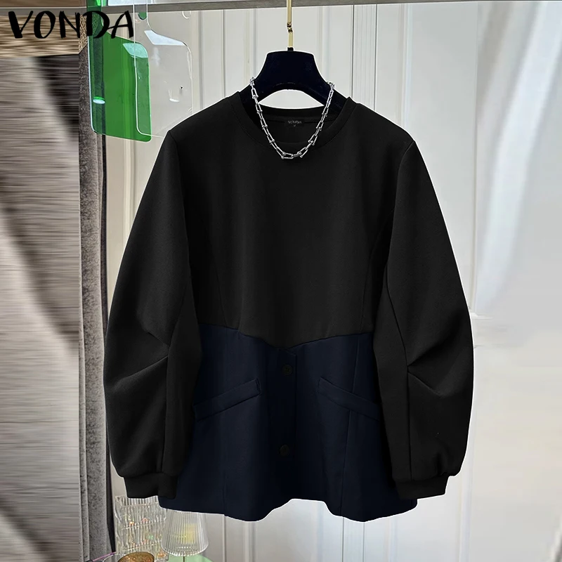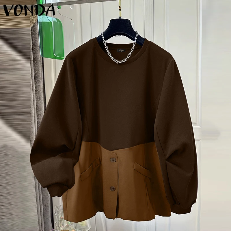 Features:Crew-neck patchwork color button-up long-sleeved hoodie