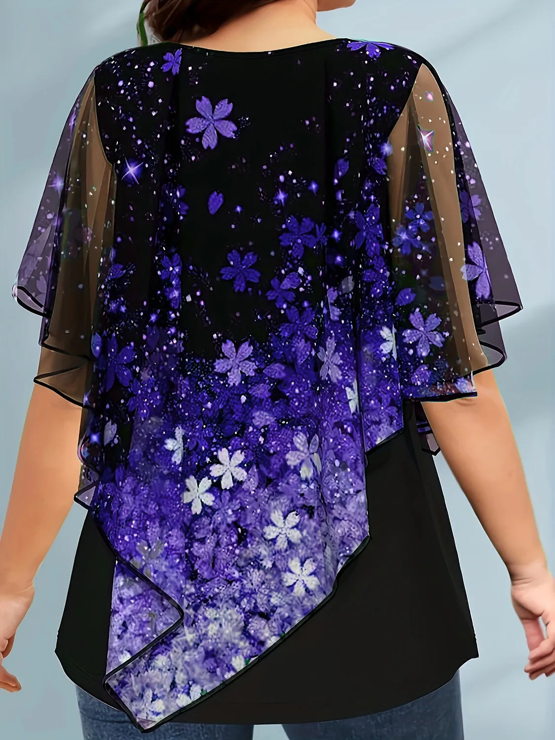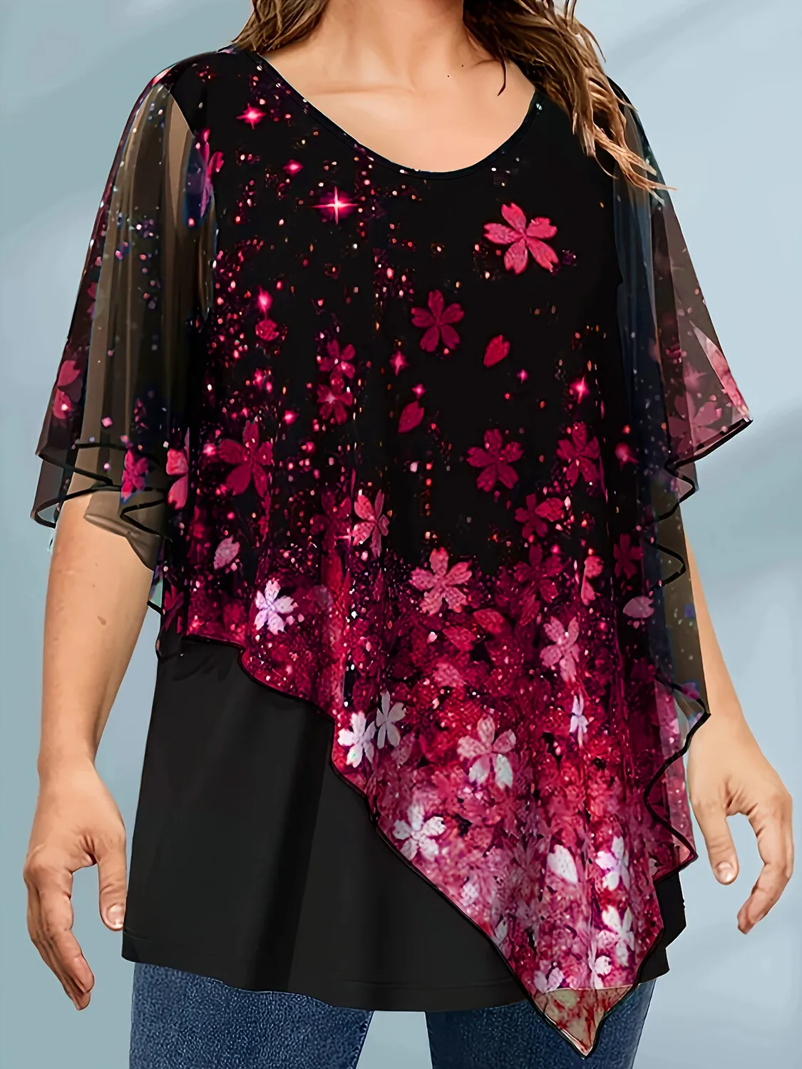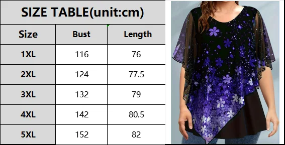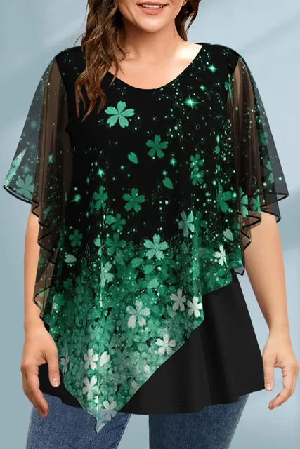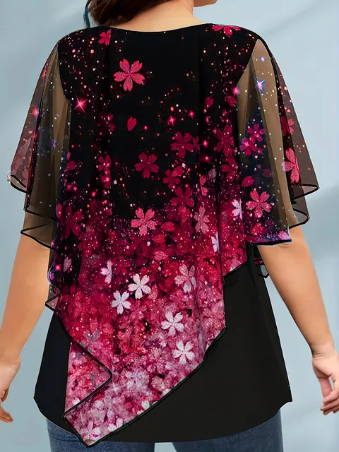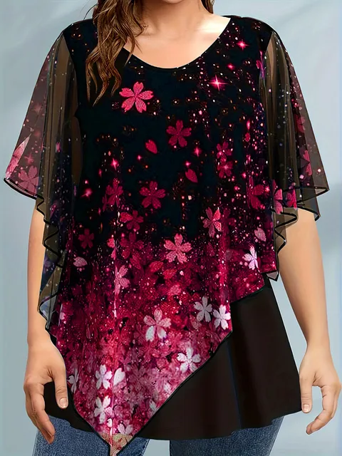 Plus Size Women T shirt Short Sleeve Casual Fake Two Piece Tops Floral Printed Vintage Loose Soft Round Neck Chiffon Tee Top