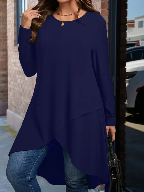 Plus Size Women's Elegant Asymmetrical Hem Long Sleeve T-Shirt Round Neck Casual Top Solid Color All-Season Clothing Pullover