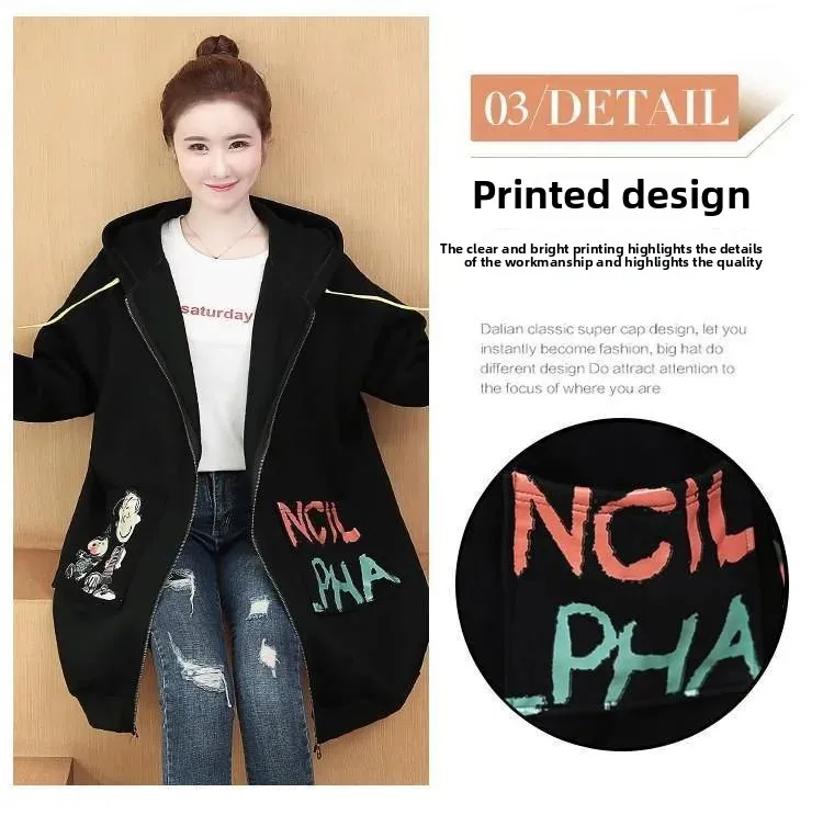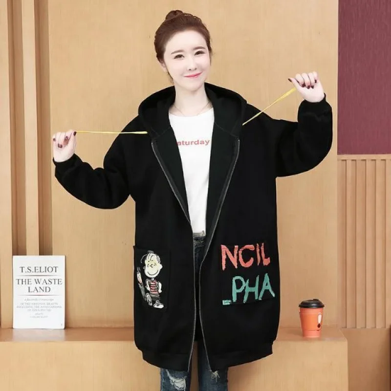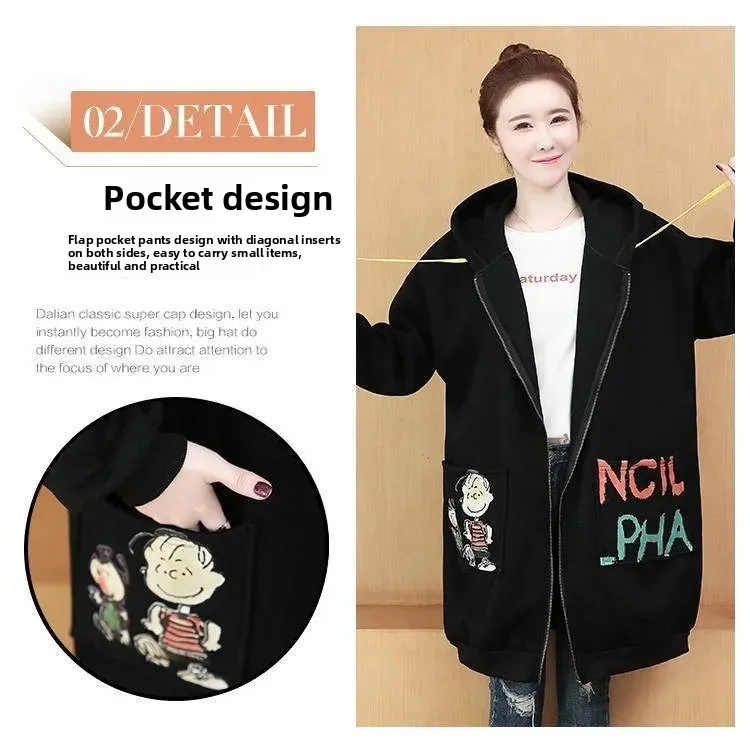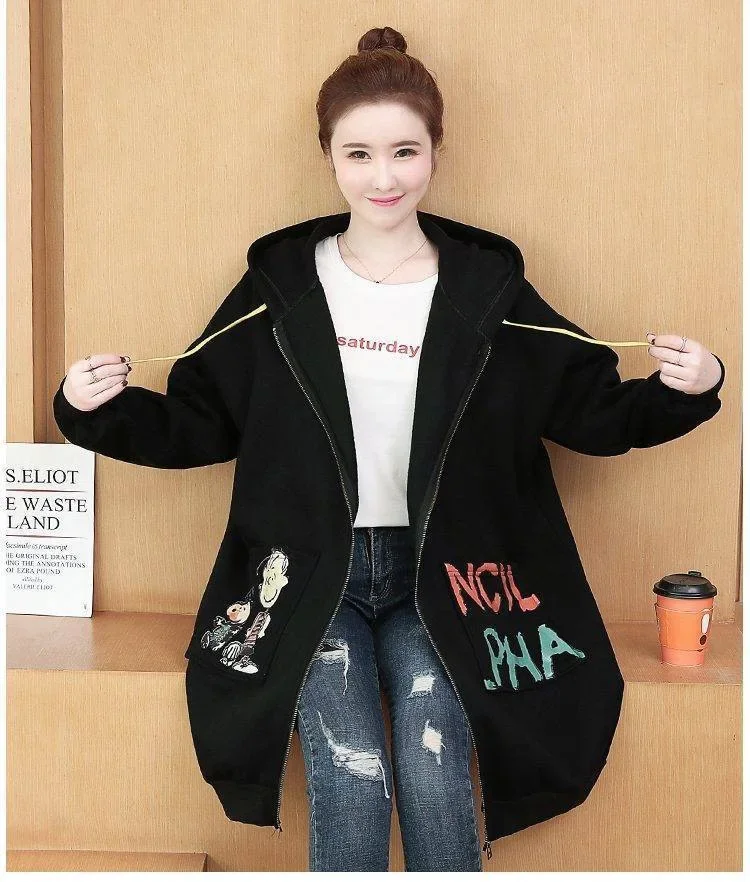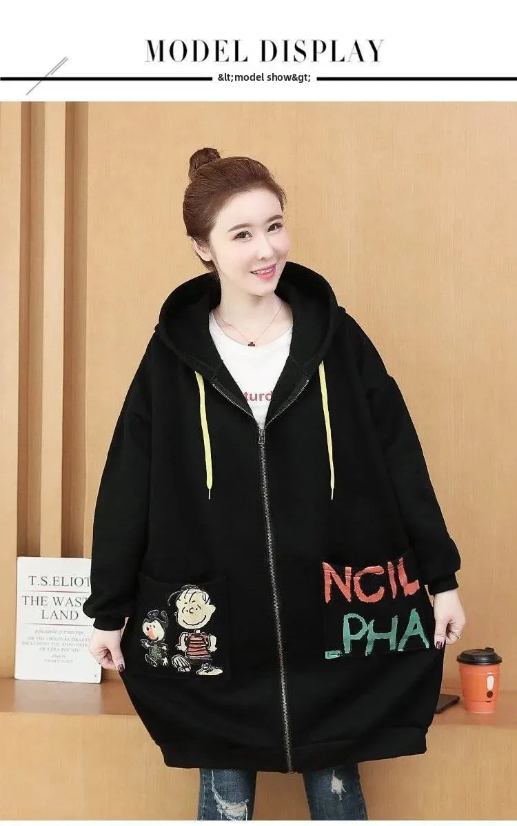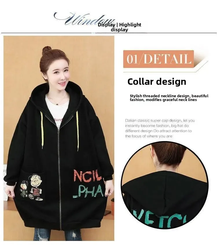Plus Size Women’s Printed Hoodie Cardigan Medium Length Thickened Warmth Fleece Lined Outerwear