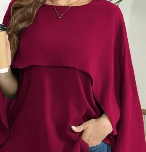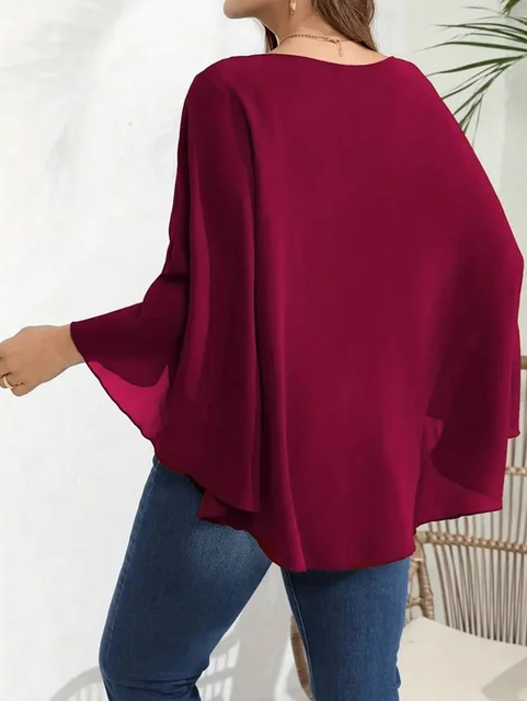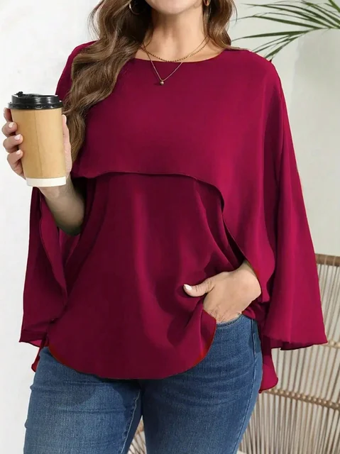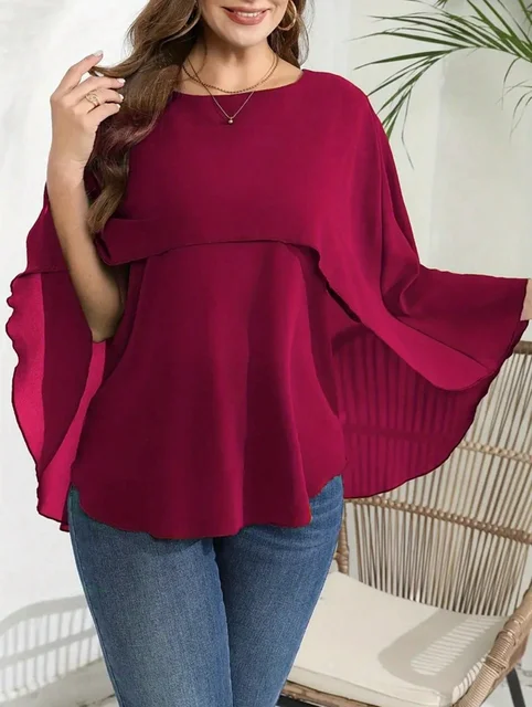 Plus Size Women’s Solid Layered Mesh Batwing Sleeve Round Neck Shirt Top Women Fashion and Comfort Cloak Top Clothing