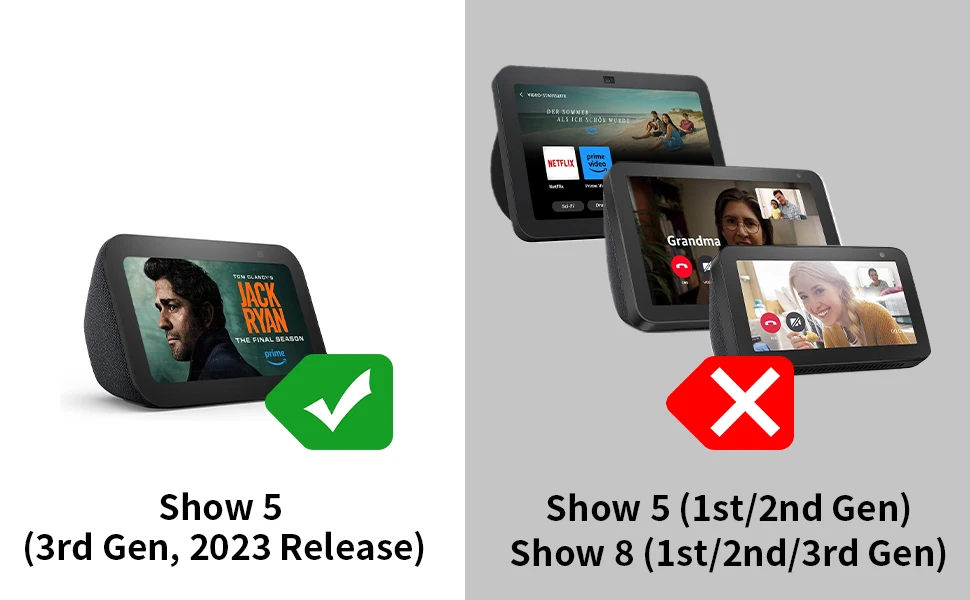 NOT compatible with Echo show 5 (1st Gen & 2nd Gen) and Echo show 8 (1st Gen & 2nd Gen)