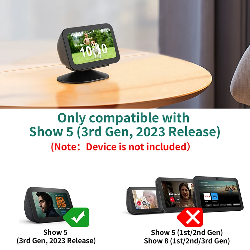 【Compatibility】The adjustable stand is only compatible with Echo show 5 (3rd Gen, 2023). ❌NOT compatible with Echo show 5 (1st Gen & 2nd Gen) and Echo show 8 (1st Gen & 2nd Gen). Only a desk stand, do not include device.
