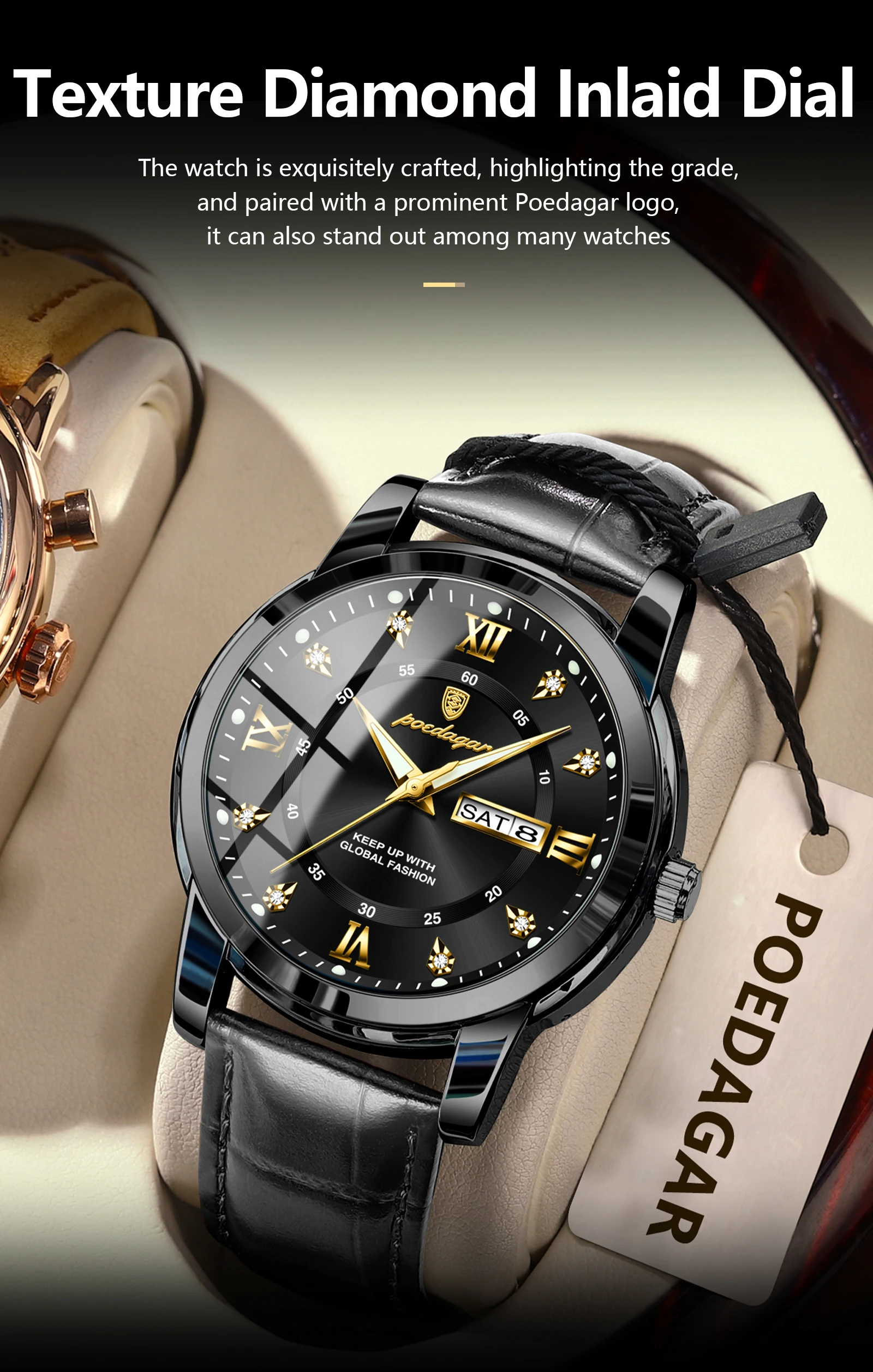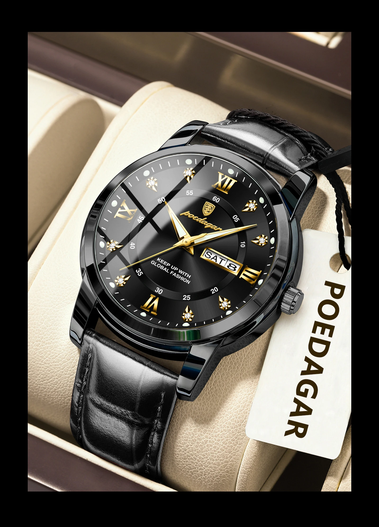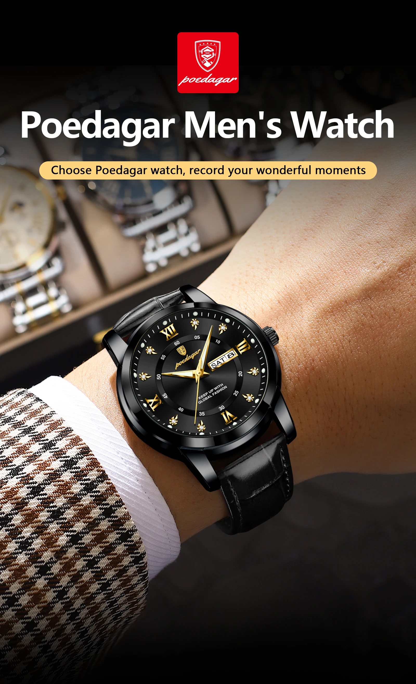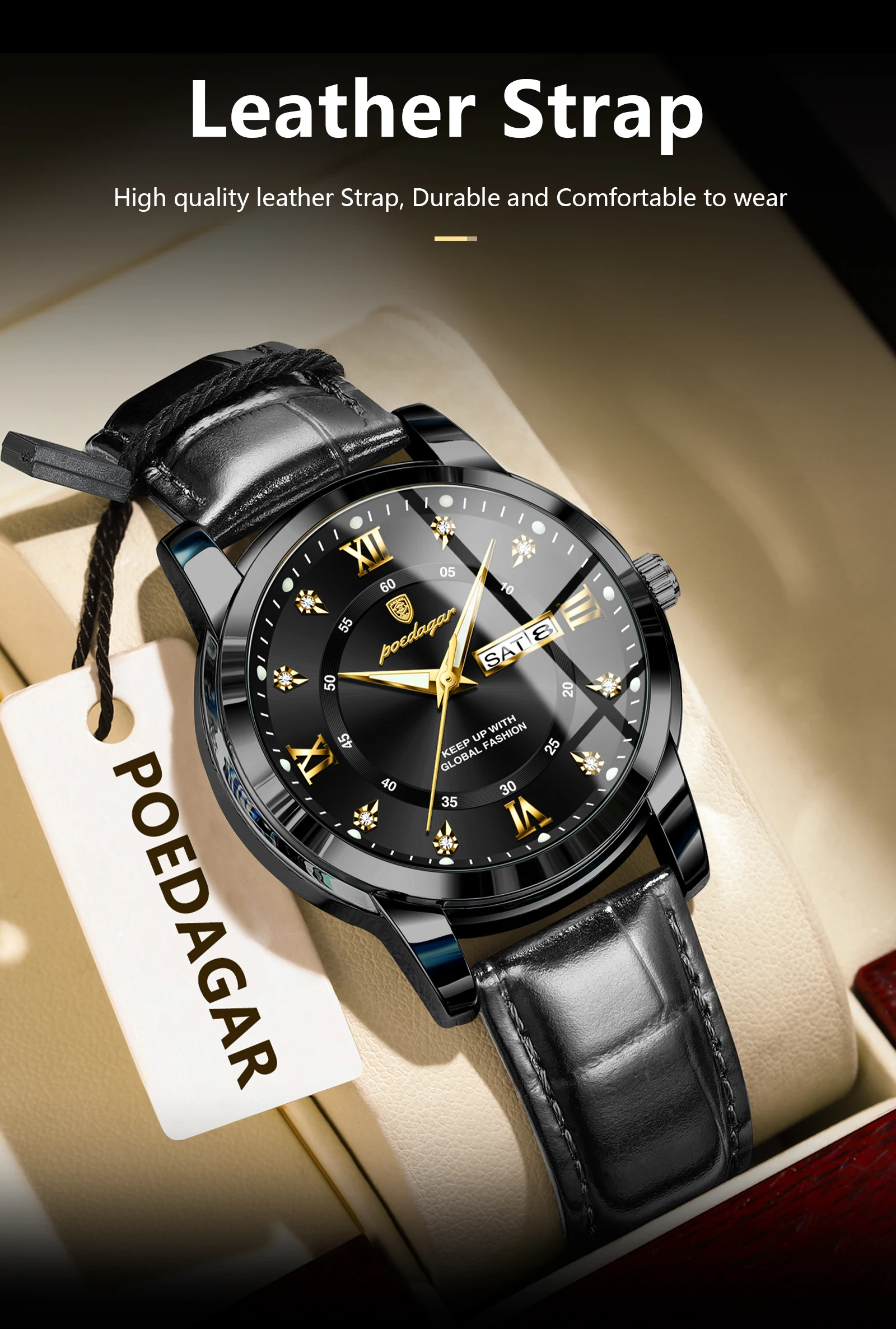 POEDAGAR Trendy Men Watch Leather Date Week Luxury Quartz Man Wristwatch Waterproof Luminous Business Casual Men's Watches Reloj